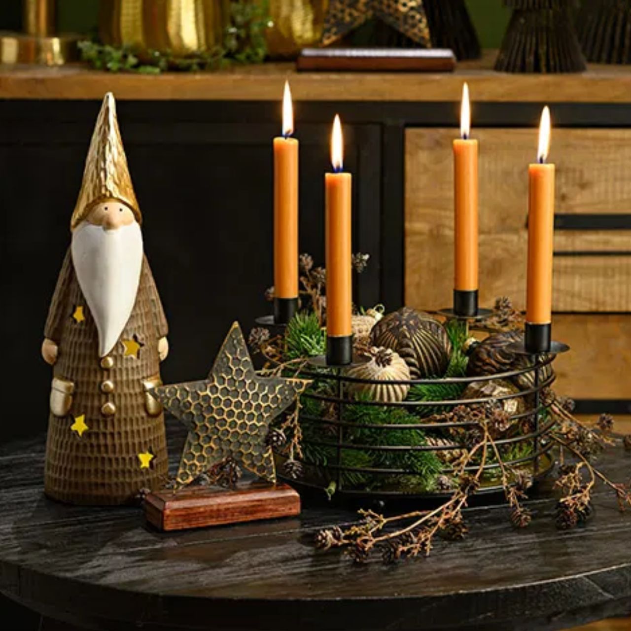 Das Gesteck bietet Platz für vier Kerzen und eignet sich perfekt für den Advent. Ob auf dem Esstisch, dem Sideboard oder auf einer festlich gedeckten Tafel, es schafft eine warme und gemütliche Stimmung. Dank der hochwertigen Verarbeitung ist es langlebig und jedes Jahr aufs Neue einsetzbar.