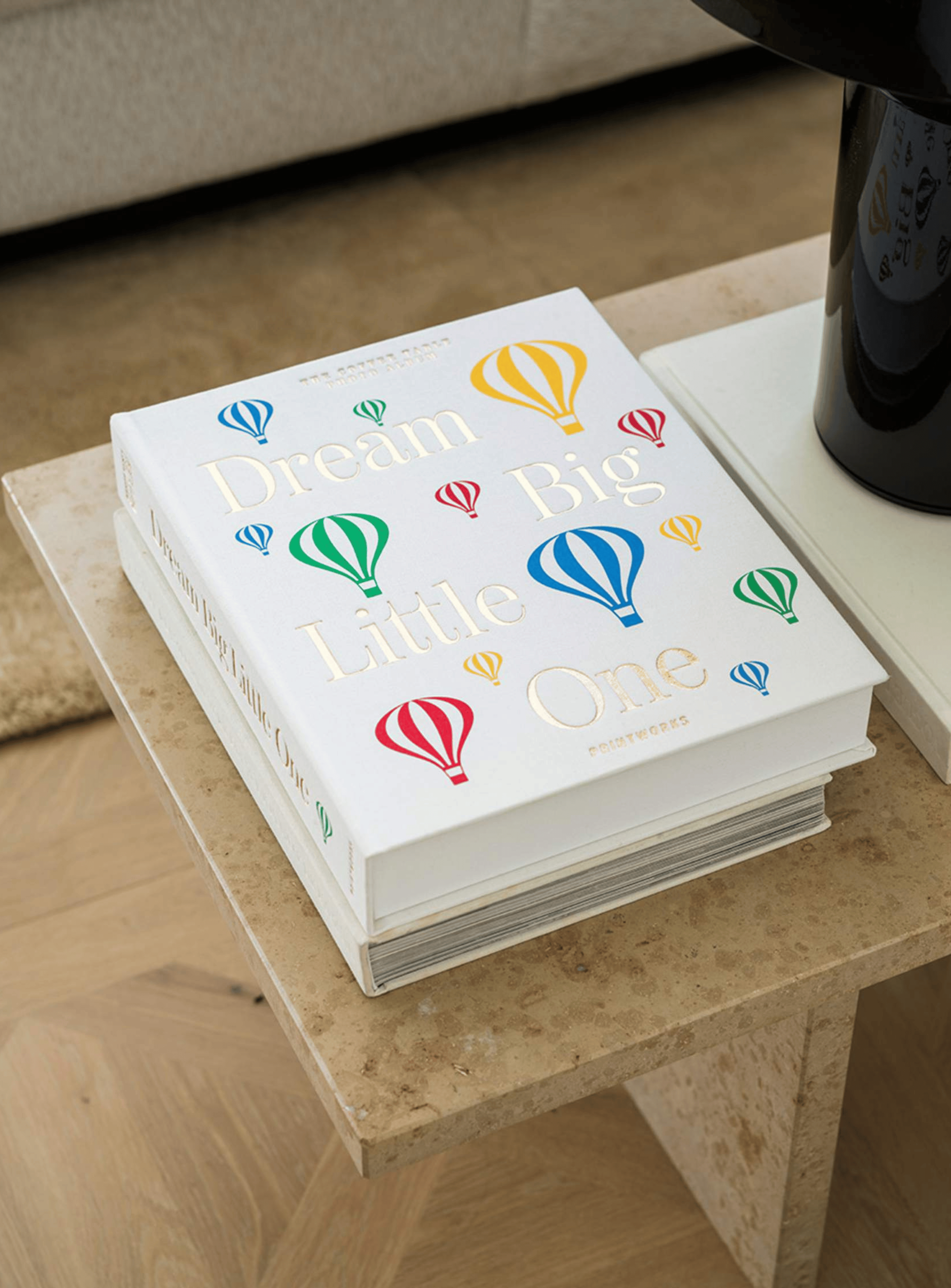 Das Babyalbum Dream Big Little One ist ein liebevoll gestaltetes Coffee Table Fotoalbum, ideal um die ersten Jahre deines Babys stilvoll festzuhalten oder als persönliches Geschenk für frischgebackene Eltern. Der beige Stoffeinband mit goldgeprägtem Titel und bunt gedruckten Ballons macht das Album zu einem dekorativen Hingucker auf jedem Tisch oder Bücherregal.