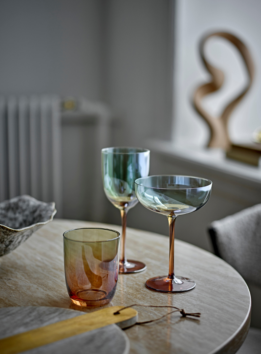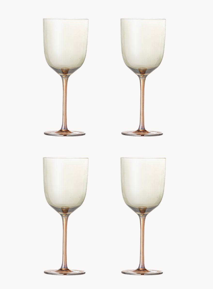 Die Aston Weingläser begeistern mit einer bronzefarbenen Oberfläche und einer feinen perlmuttfarbenen Kante, die das Licht besonders schön reflektiert. Ihr edler, schimmernder Look macht sie perfekt für Wein, stilvolle Tischdekorationen und besondere Anlässe. Das hochwertige Finish setzt einen eleganten Akzent auf jedem gedeckten Tisch.