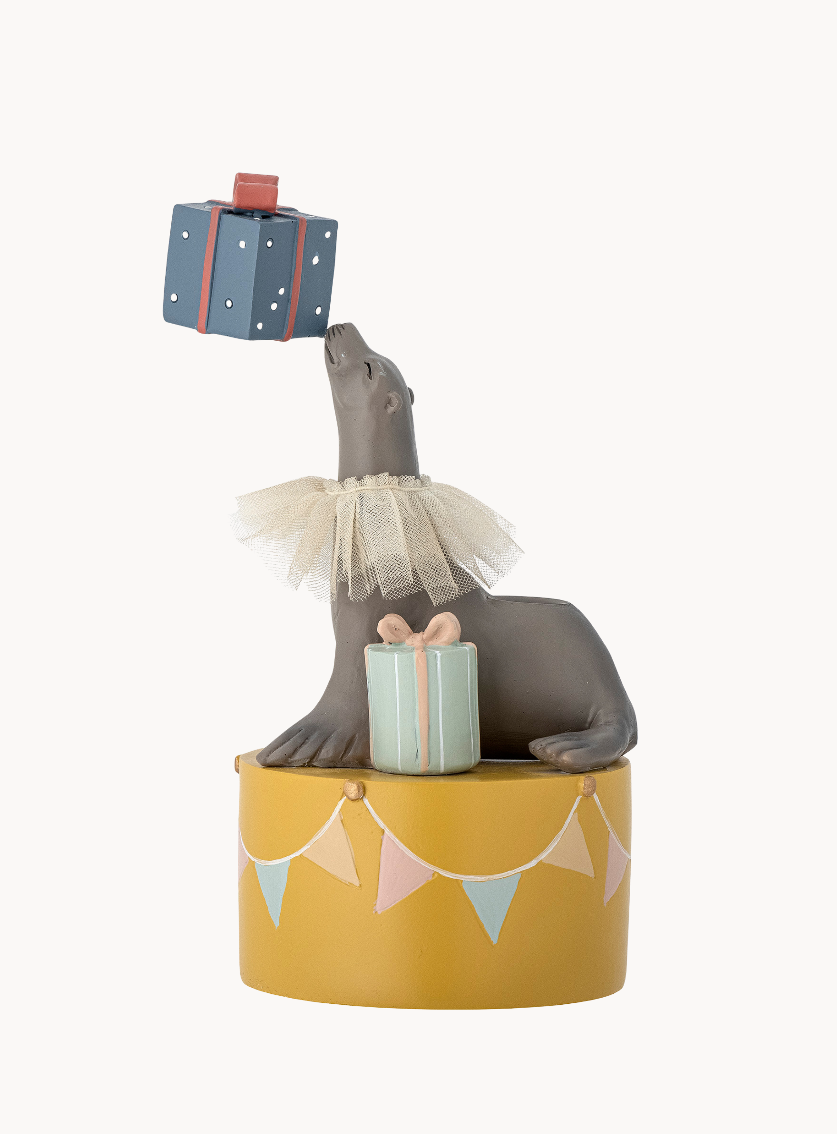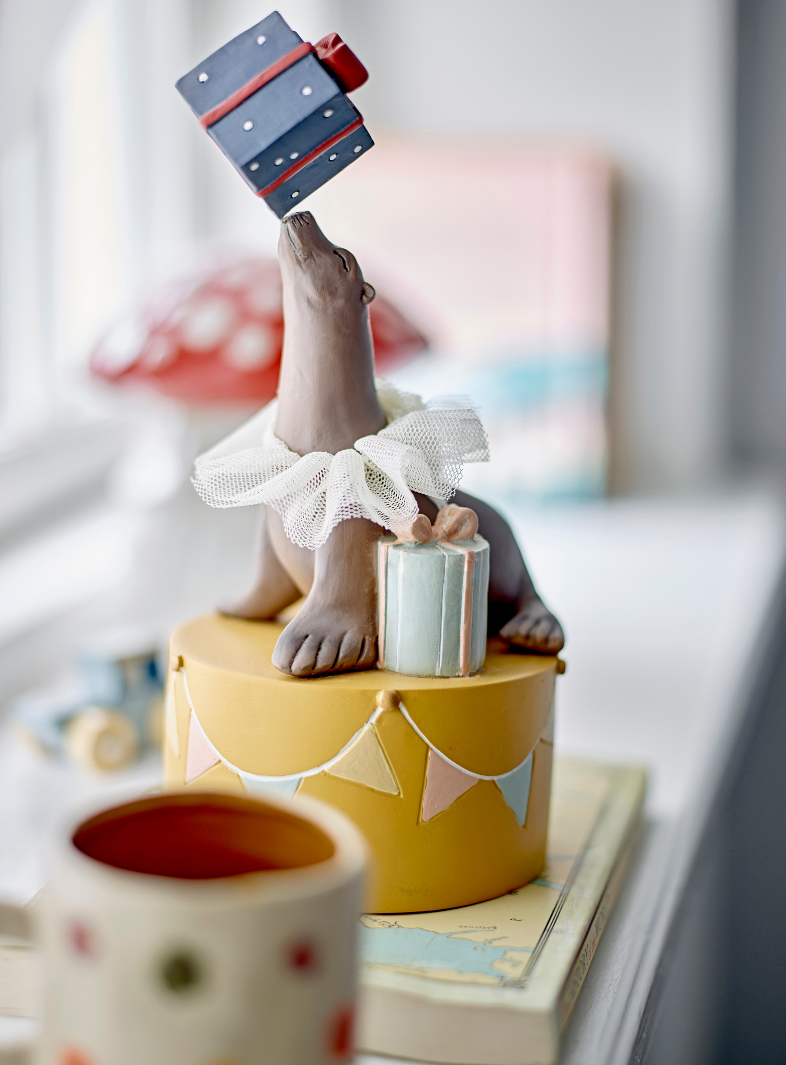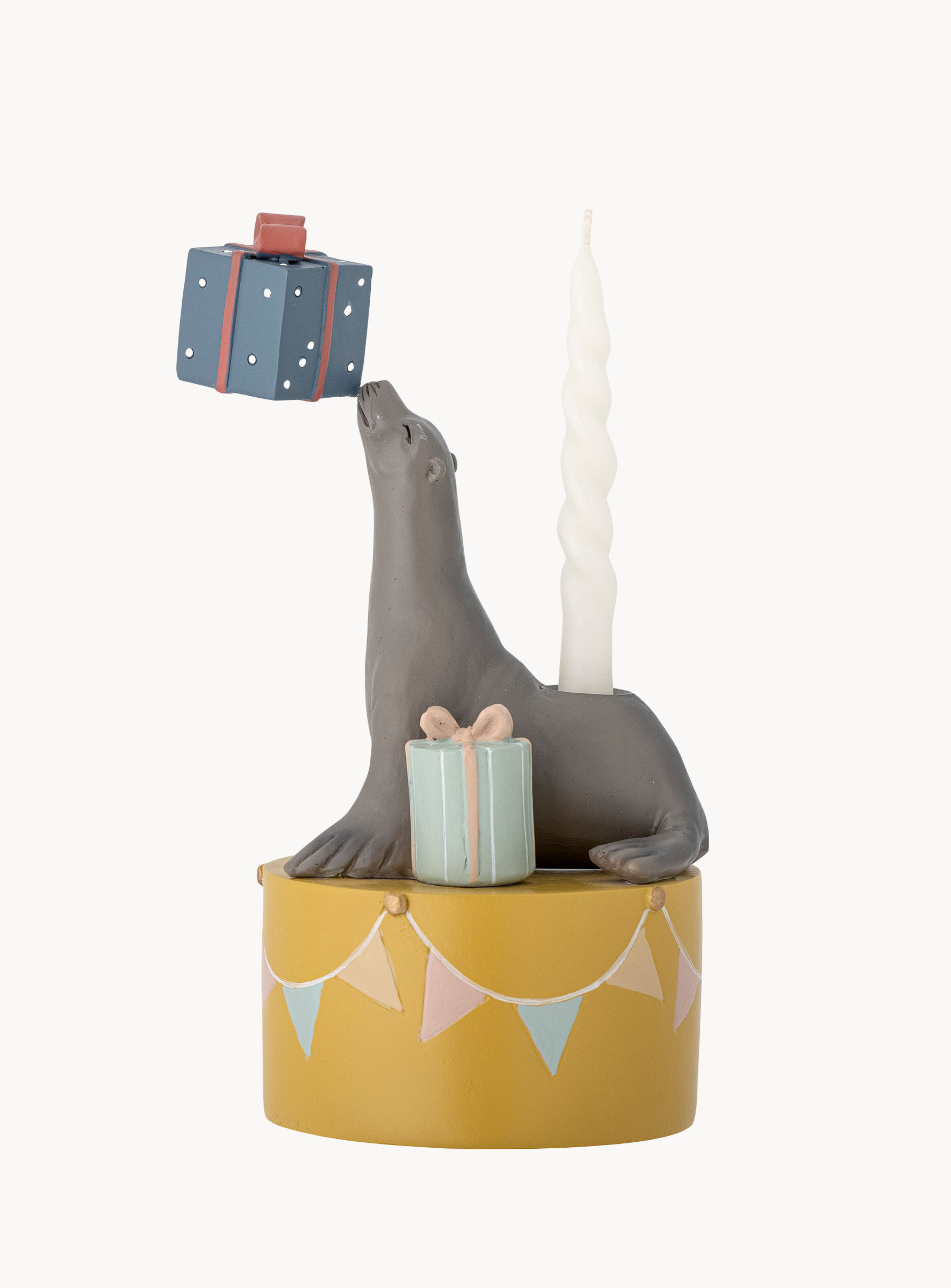 Dieser liebevoll gestaltete Kerzenhalter zeigt einen kleinen Seelöwen, der ein Geschenk balanciert und mit seinem Stoffkragen für einen besonders fröhlichen Look sorgt. Er ist eine schöne Ergänzung für den Geburtstagstisch und ein Geschenk, an dem Kinder viele Jahre Freude haben. Für die sichere Nutzung im Kinderzimmer empfehlen sich LED-Kerzen. Bei normalen Kerzen muss der Stoffkragen vor dem Anzünden entfernt werden. Der Kerzenhalter sollte immer nur unter Aufsicht eines Erwachsenen genutzt werden.