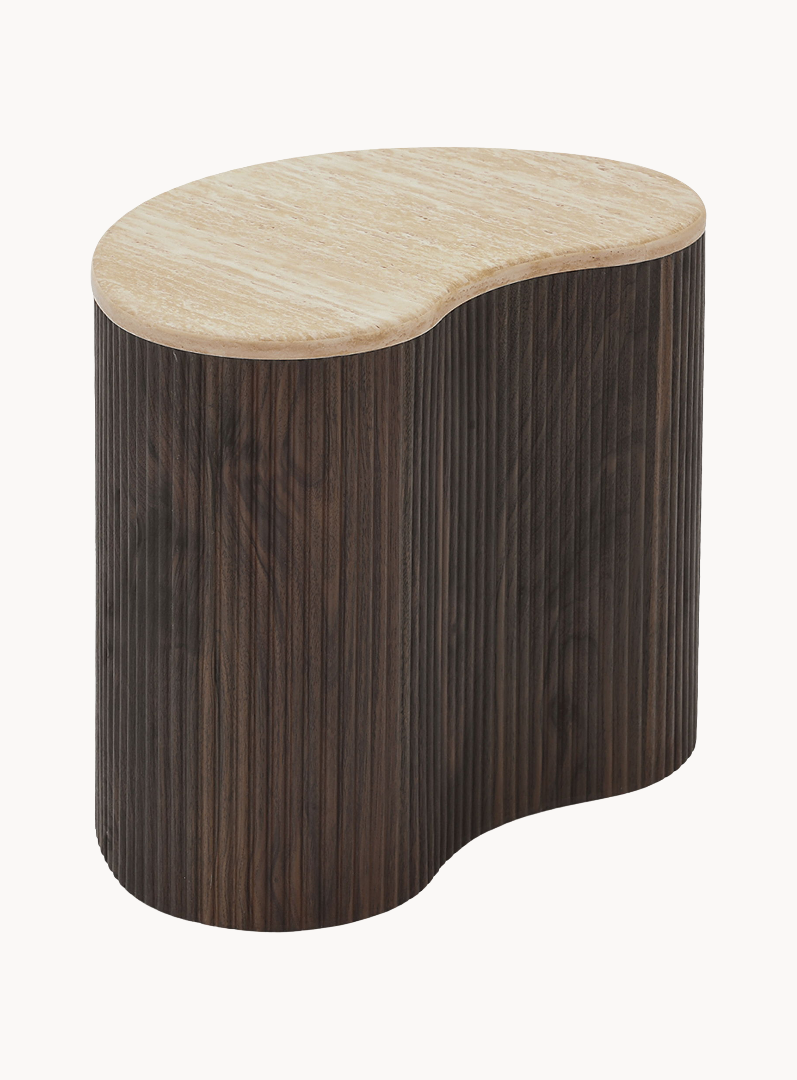 Der Cadiz Beistelltisch überzeugt mit seiner eleganten Travertinoptik in dunklem Braun und einem modernen, klaren Design. Seine kompakte Form macht ihn vielseitig einsetzbar – ob als Ablage im Wohnzimmer, Nachttisch im Schlafzimmer oder als stilvolles Einzelstück im Eingangsbereich.