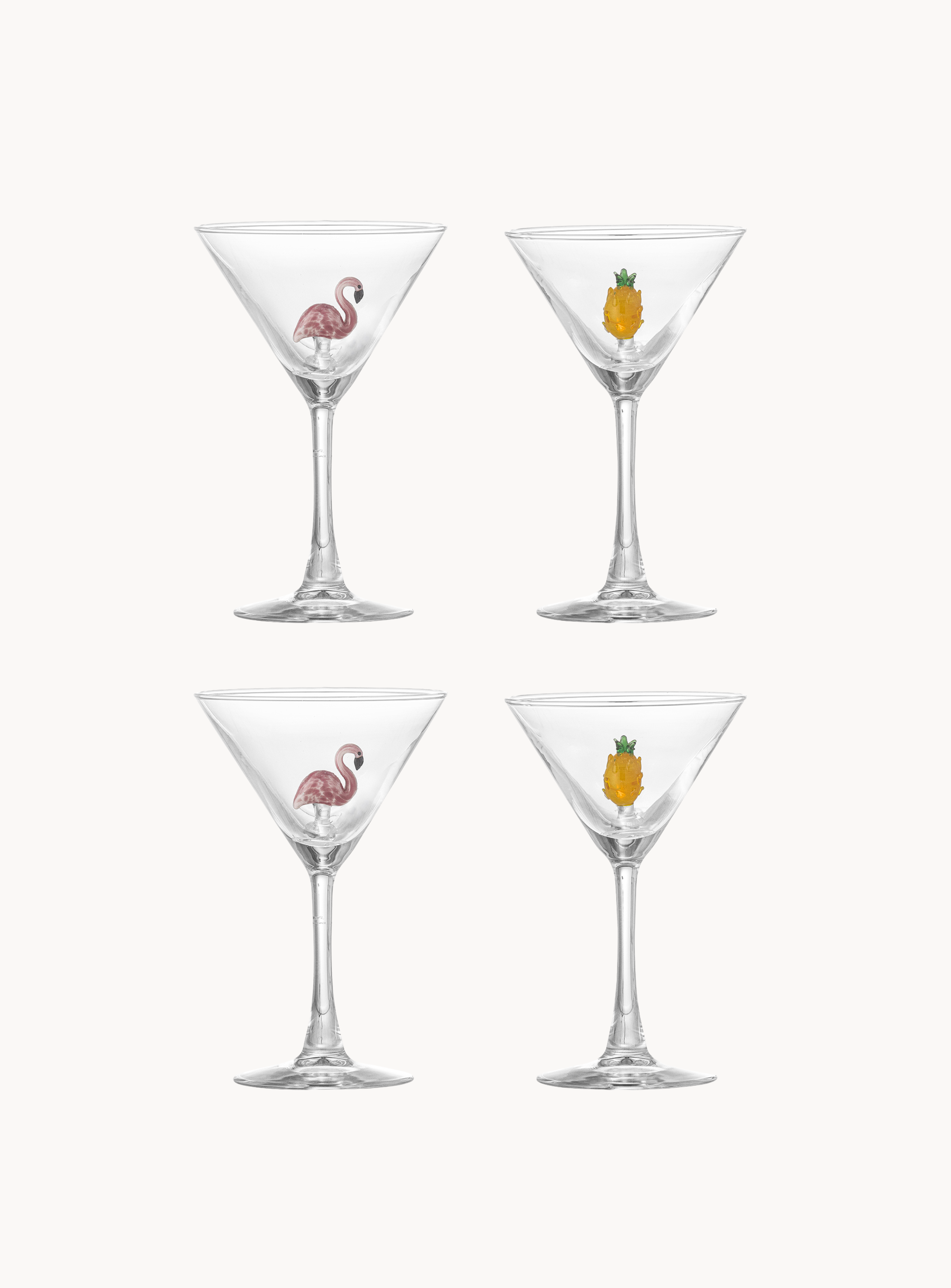 Dieses Misa Cocktailglas-Set bringt spielerische Sommerstimmung auf den Tisch: Zwei Gläser zeigen einen rosafarbenen Flamingo, zwei eine kleine Ananas in Gelb- und Grüntönen. Die Figuren sitzen im Glasboden und sind handgefertigt, während das Glas selbst mundgeblasen wird – dadurch ist jedes Stück ein individuelles Unikat. Ideal für Cocktails, Aperitifs oder als dekoratives Highlight in der Hausbar.
