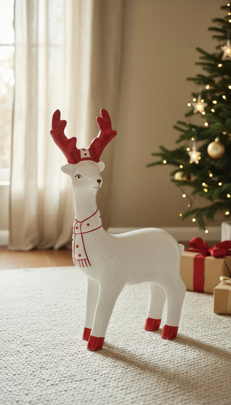 Der stilvolle Hirsch aus Dolomit in Weiß und Rot verleiht jeder Winterdekoration einen charmanten Akzent. Durch das freundliche Design und die klaren Farben wird er zu einem echten Blickfang – perfekt geeignet für Sideboards, Fensterbänke oder festlich gedeckte Tische.
