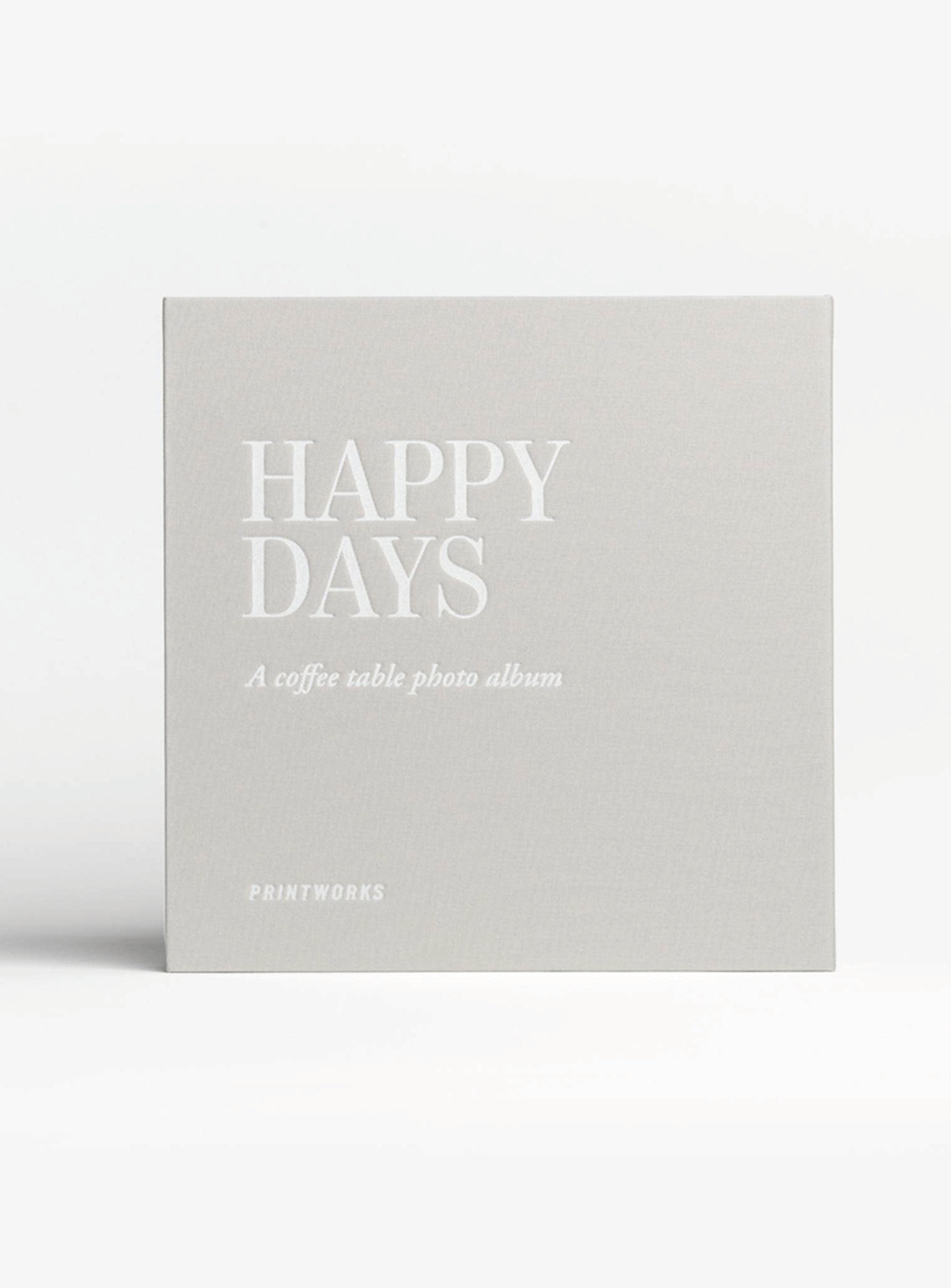 Das Fotoalbum Happy Days ist eine kompakte Version unserer Coffee Table Alben und ideal für kleinere Fotokollektionen. Der hellgraue Stoffeinband mit weißer Schrift verleiht dem Album eine moderne, dezente Eleganz, die sich harmonisch in jedes Regal oder Sideboard einfügt. Im Inneren findest du 30 Seiten aus hochwertigem schwarzem Fotokarton, die Fotos besonders stilvoll wirken lassen.