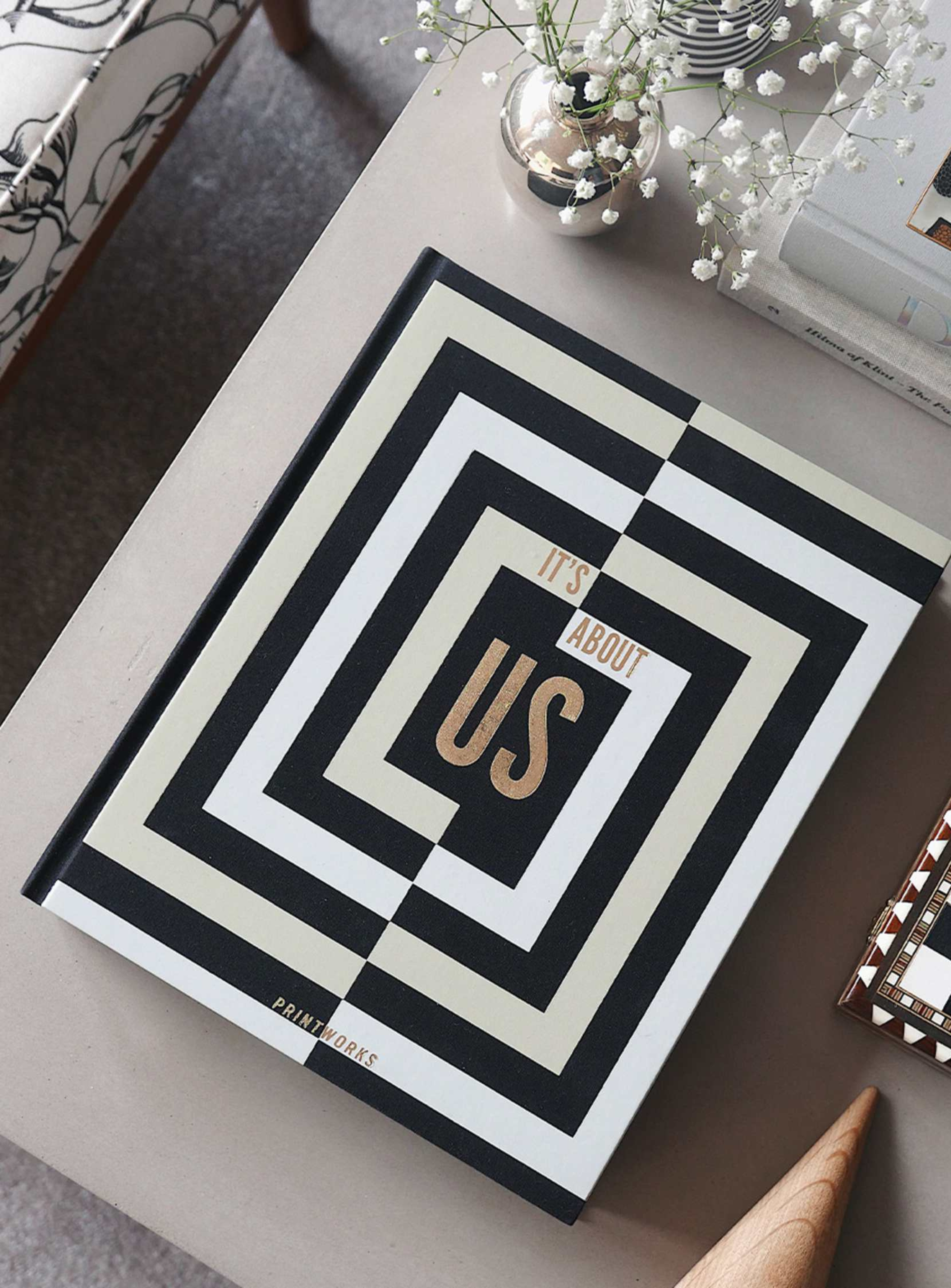 Das Fotoalbum It’s About Us ist ein stilvolles Coffee Table Album für gemeinsame Erinnerungen. Der beige Stoffeinband mit blauer Schrift verleiht dem Album eine ruhige, harmonische Ausstrahlung und macht es zu einem dekorativen Element auf jedem Tisch oder Regal. Im Inneren befinden sich 30 Seiten aus hochwertigem schwarzem Fotokarton, der Fotos besonders elegant wirken lässt.