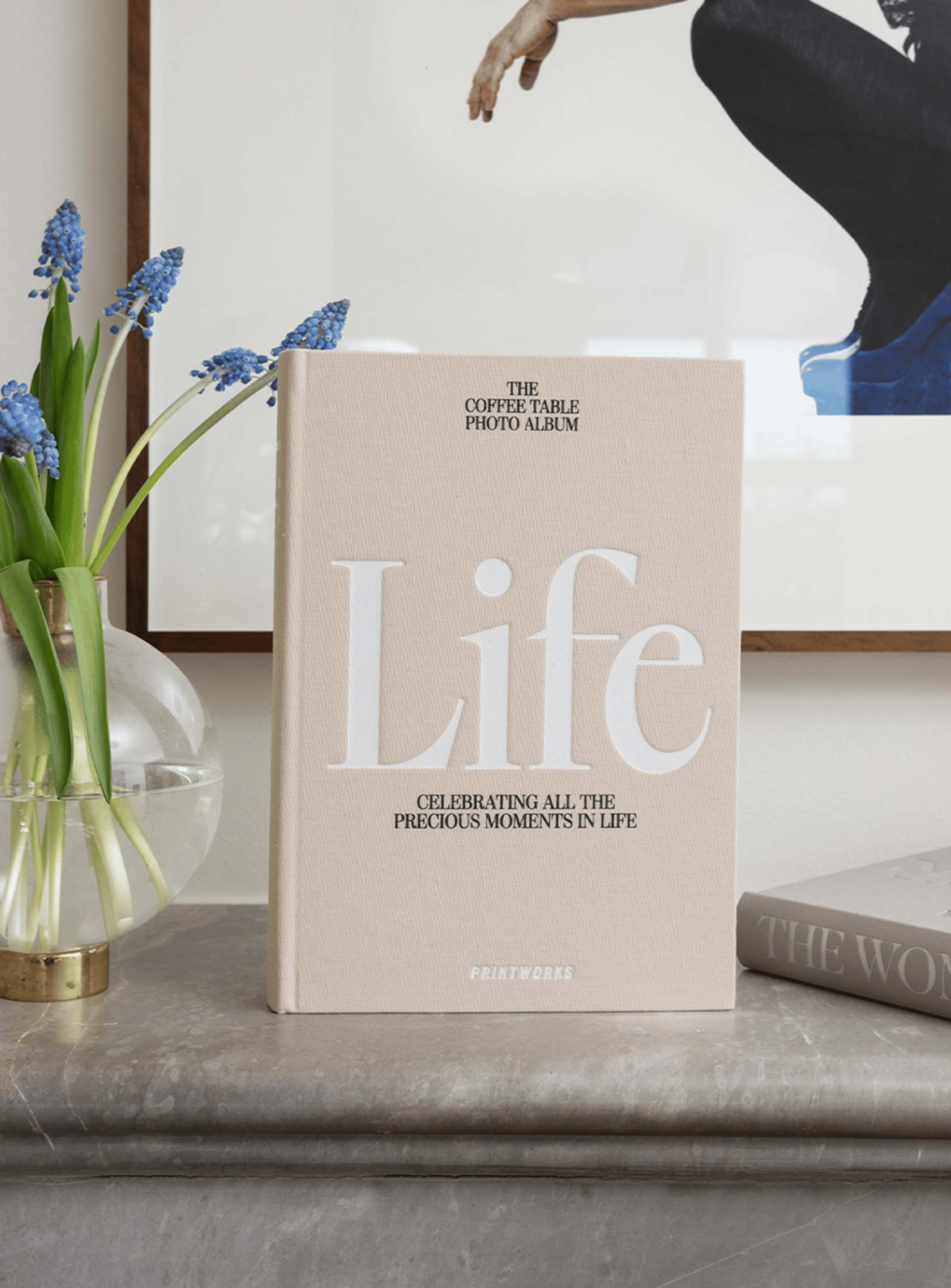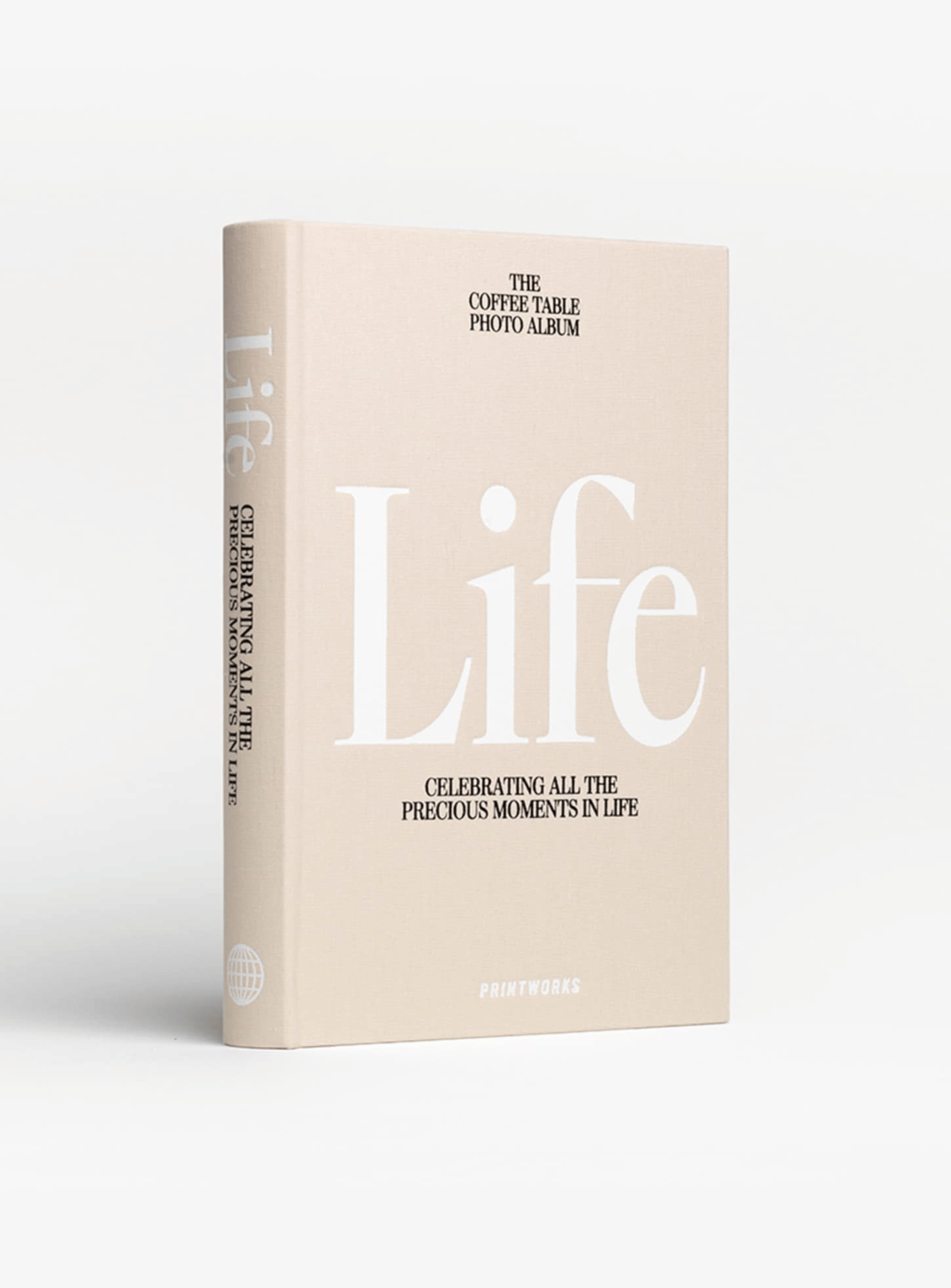 Das Fotoalbum Life ist einer unserer Bestseller und eine elegante Alternative zu klassischen Coffee Table Alben. Mit seinem beigen Einband und der weißen Schrift fügt es sich harmonisch in jedes Bücherregal ein und wird gleichzeitig zu einem schönen Dekoelement. Auf 80 Seiten aus hochwertigem cremeweißem Papier finden bis zu 160 Fotos im Querformat Platz, jeweils bis zu einer Größe von 11 x 15 cm. Die Fotos lassen sich einfach mit unseren Fotostickern oder Fotoecken befestigen, die separat erhältlich sind.