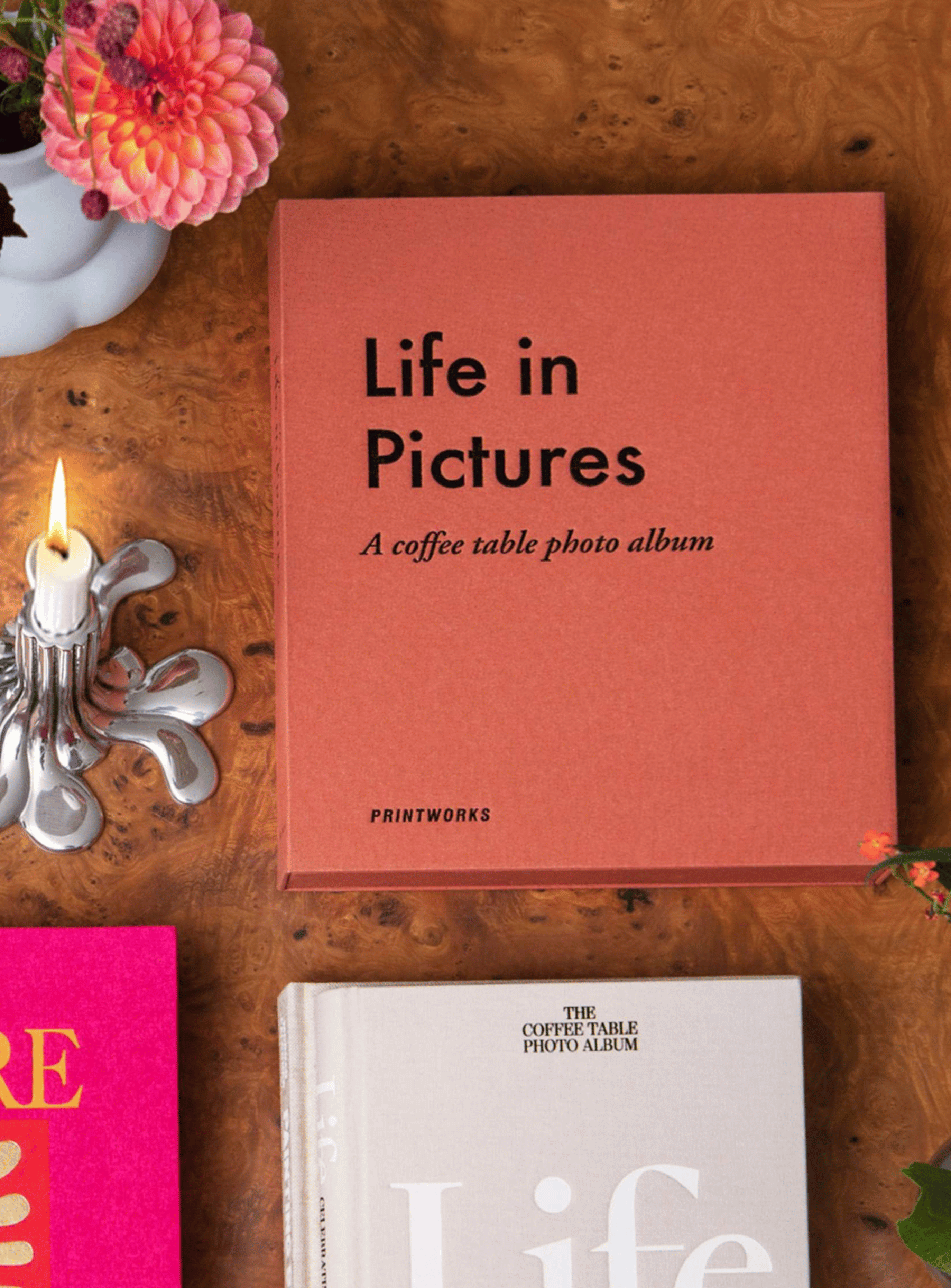 Das Fotoalbum Life in Pictures ist ein stilvolles Coffee Table Album mit einem hochwertigen Stoffeinband in Terracotta Orange und schwarzer Prägung. Die warme Farbe macht das Album zu einem dekorativen Blickfang im Regal oder auf dem Wohnzimmertisch. Im Inneren befinden sich 30 Seiten aus hochwertigem schwarzem Fotokarton, die deinen Bildern eine moderne, elegante Wirkung verleihen.
