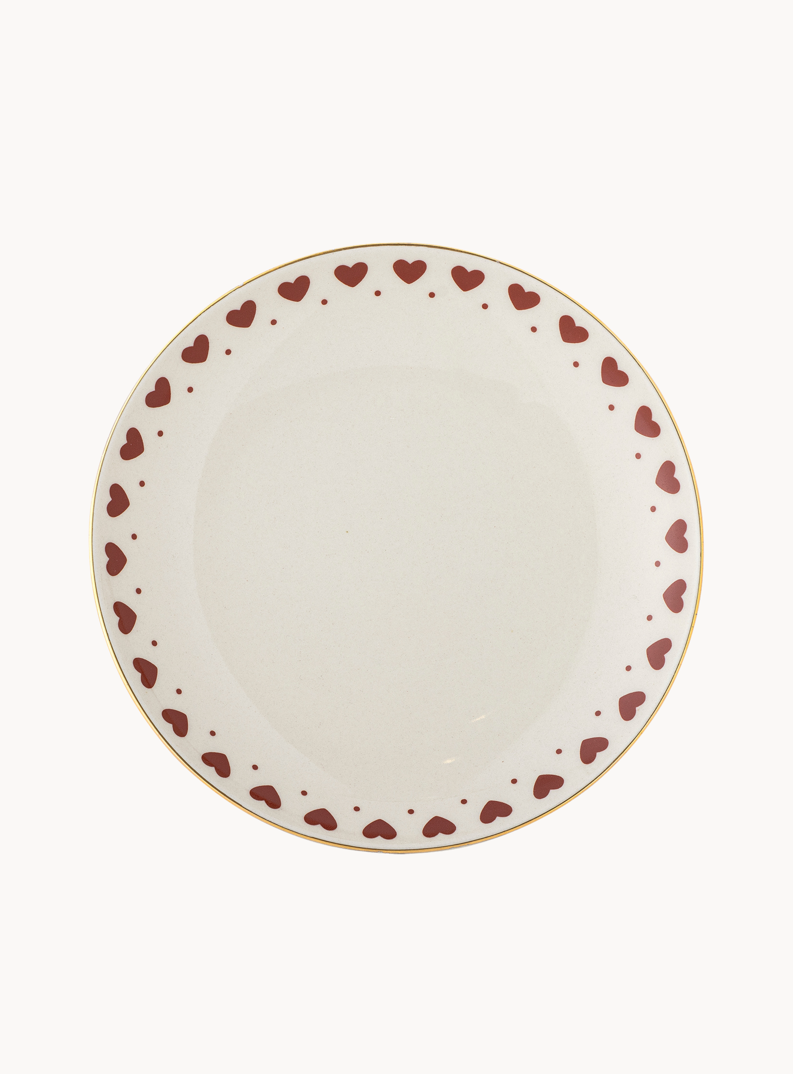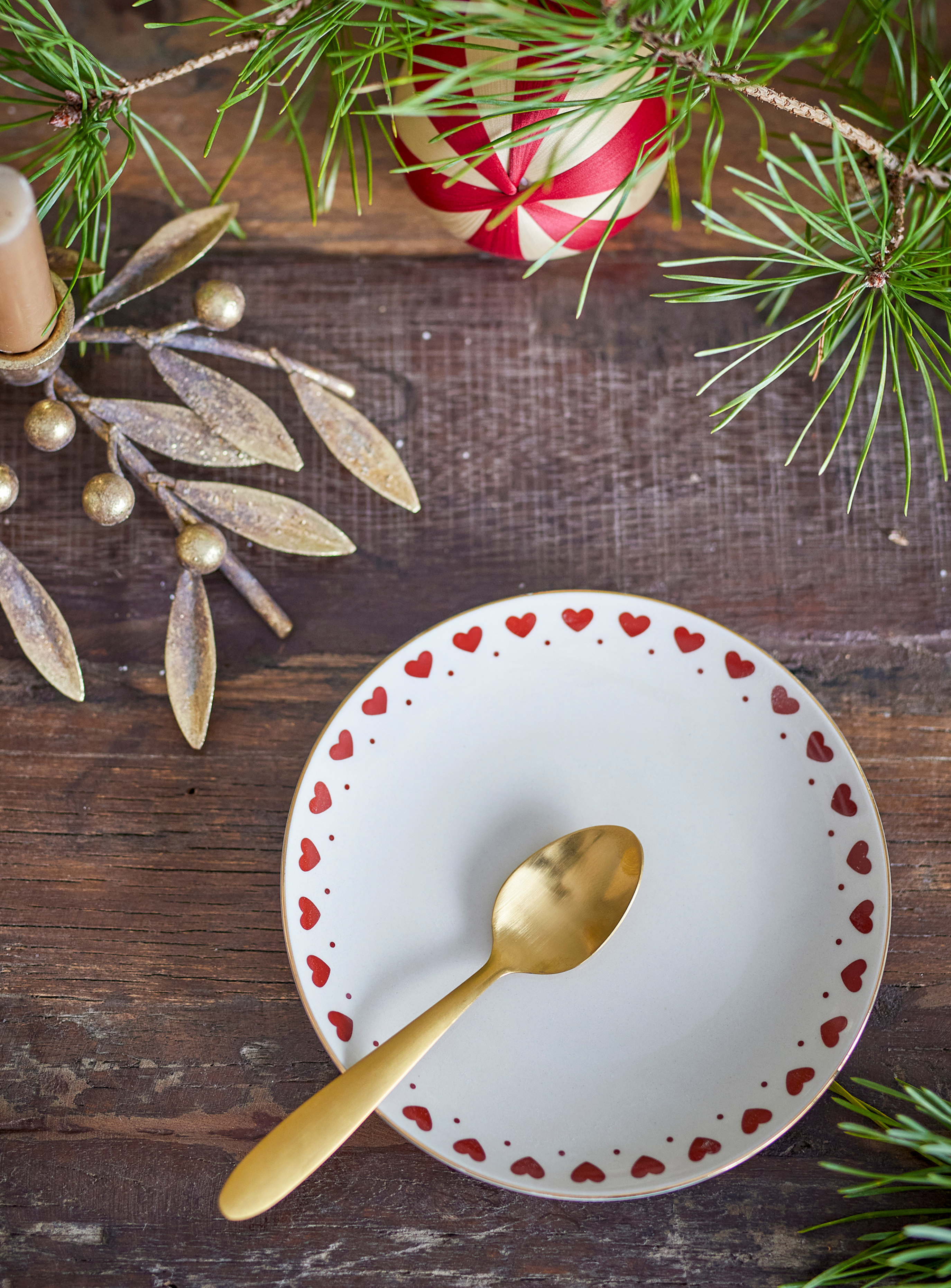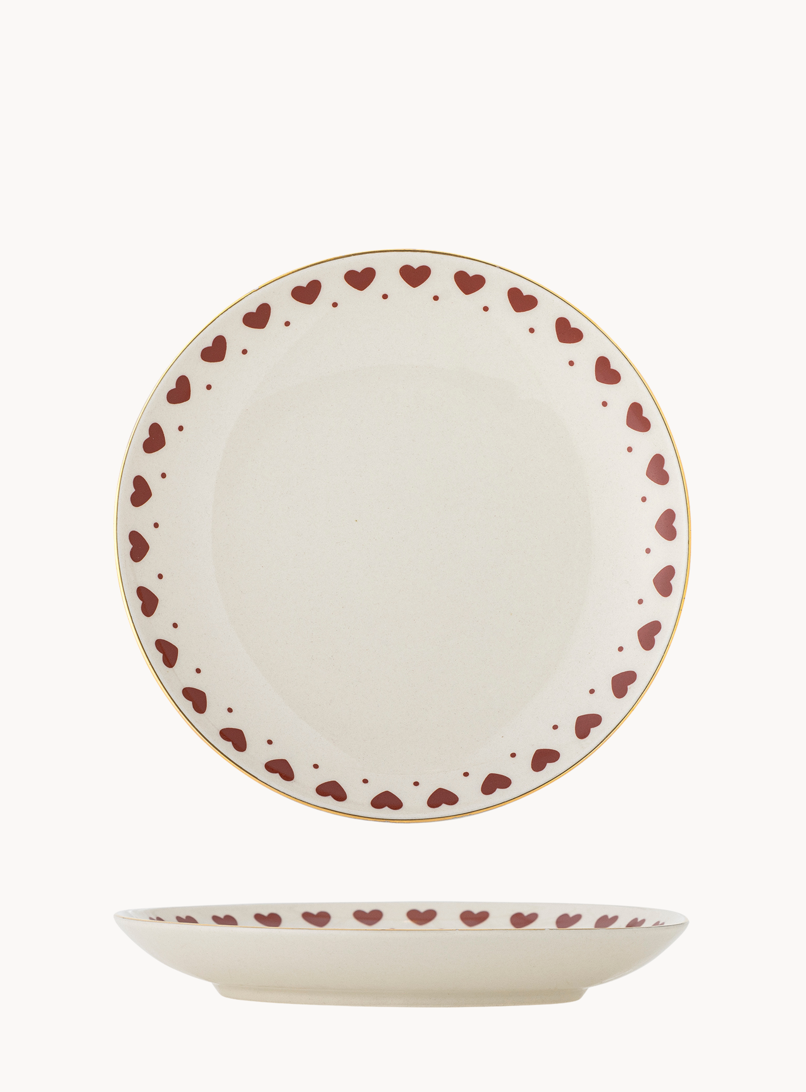Der Jolly Teller von Bloomingville verleiht jedem Tisch eine festliche Note. Mit seinem zarten Herzmotiv und dem handbemalten goldenen Rand strahlt er Eleganz und Wärme aus. Jeder Teller ist durch die handgearbeiteten Details ein Unikat. Ideal als Dessertteller oder für kleine Leckereien – perfekt für besondere Anlässe oder den gemütlichen Alltag.