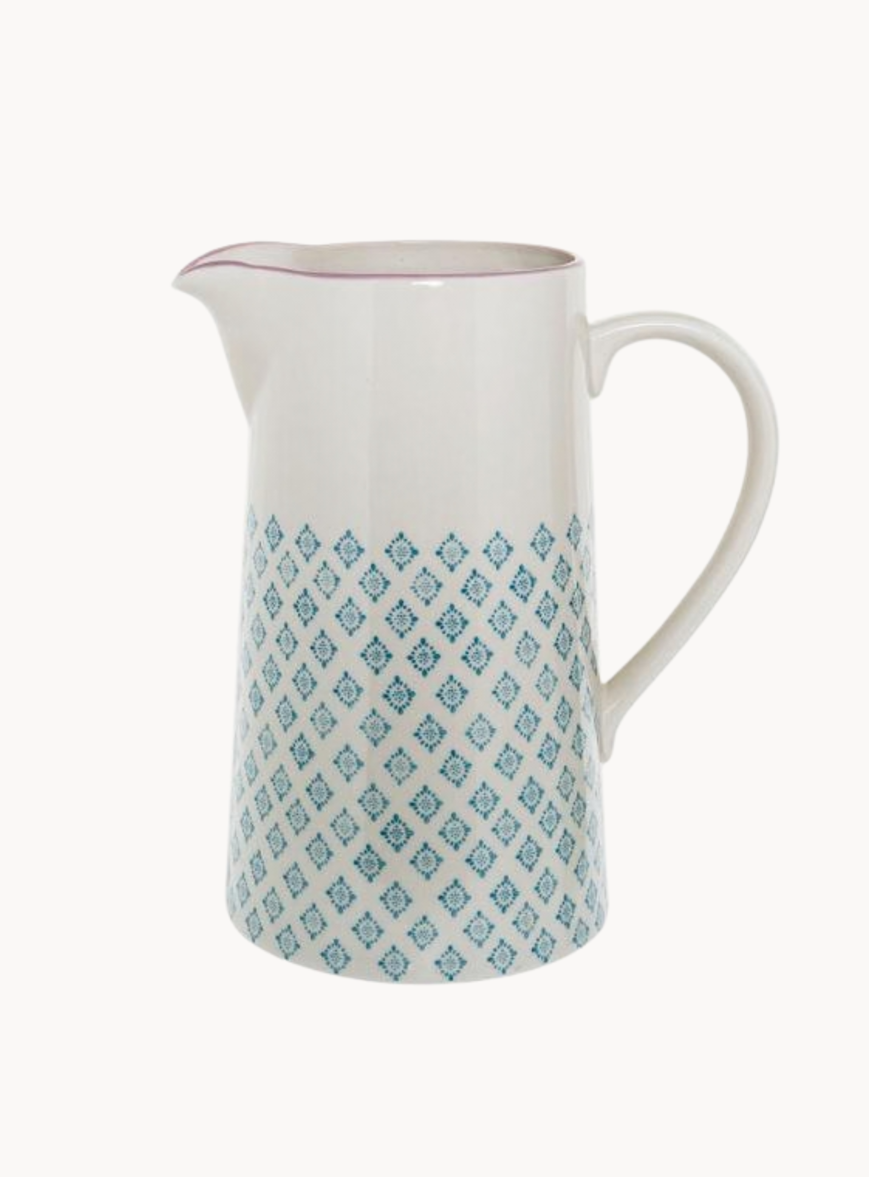 Der Krug aus der Neumühle Kollektion "Aufblühen" überzeugt mit seiner klassischen Form und einem ruhigen, harmonischen Design. Die beige Grundfläche wird von sanften blauen Mustern geprägt, die nach oben hin leichter werden und durch einen feinen rosafarbenen Rand elegant ergänzt sind. Die Kombination aus gedruckten und handbemalten Details verleiht dem Krug eine besondere, individuelle Note. Ideal für Wasser, Saft oder Limonade und eine stilvolle Ergänzung für den Alltagstisch.