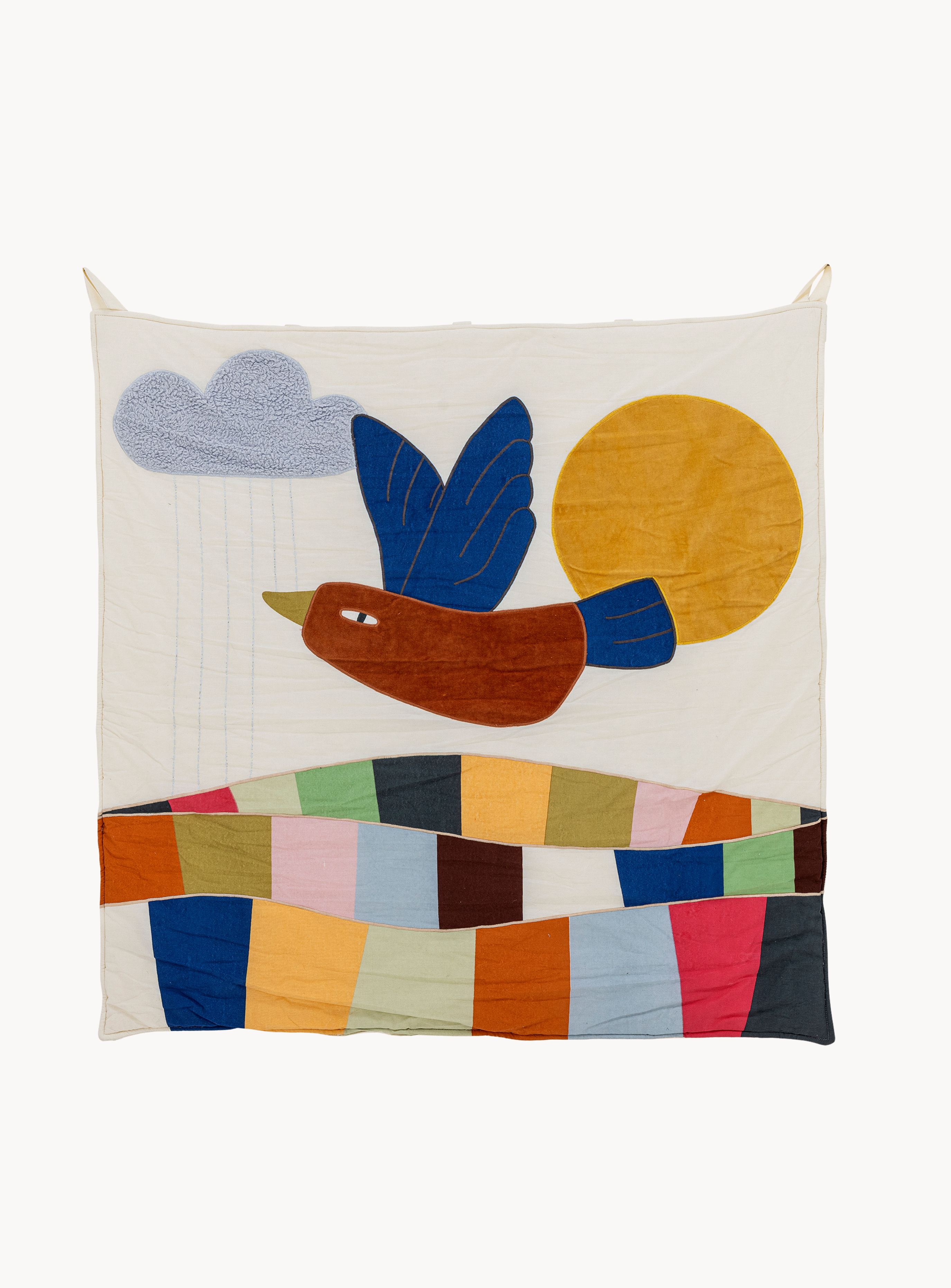 Die weiche Wanddekoration zeigt einen stilvollen Vogel, der über eine ruhige Landschaft fliegt, und bringt sofort Wärme und Persönlichkeit ins Kinderzimmer. Das große Format setzt einen schönen, ruhigen Akzent an der Wand und schafft eine gemütliche Atmosphäre. Gefertigt aus 100 % Baumwolle ist das Wandbild angenehm im Look & Feel und perfekt für eine natürliche, liebevolle Einrichtung.