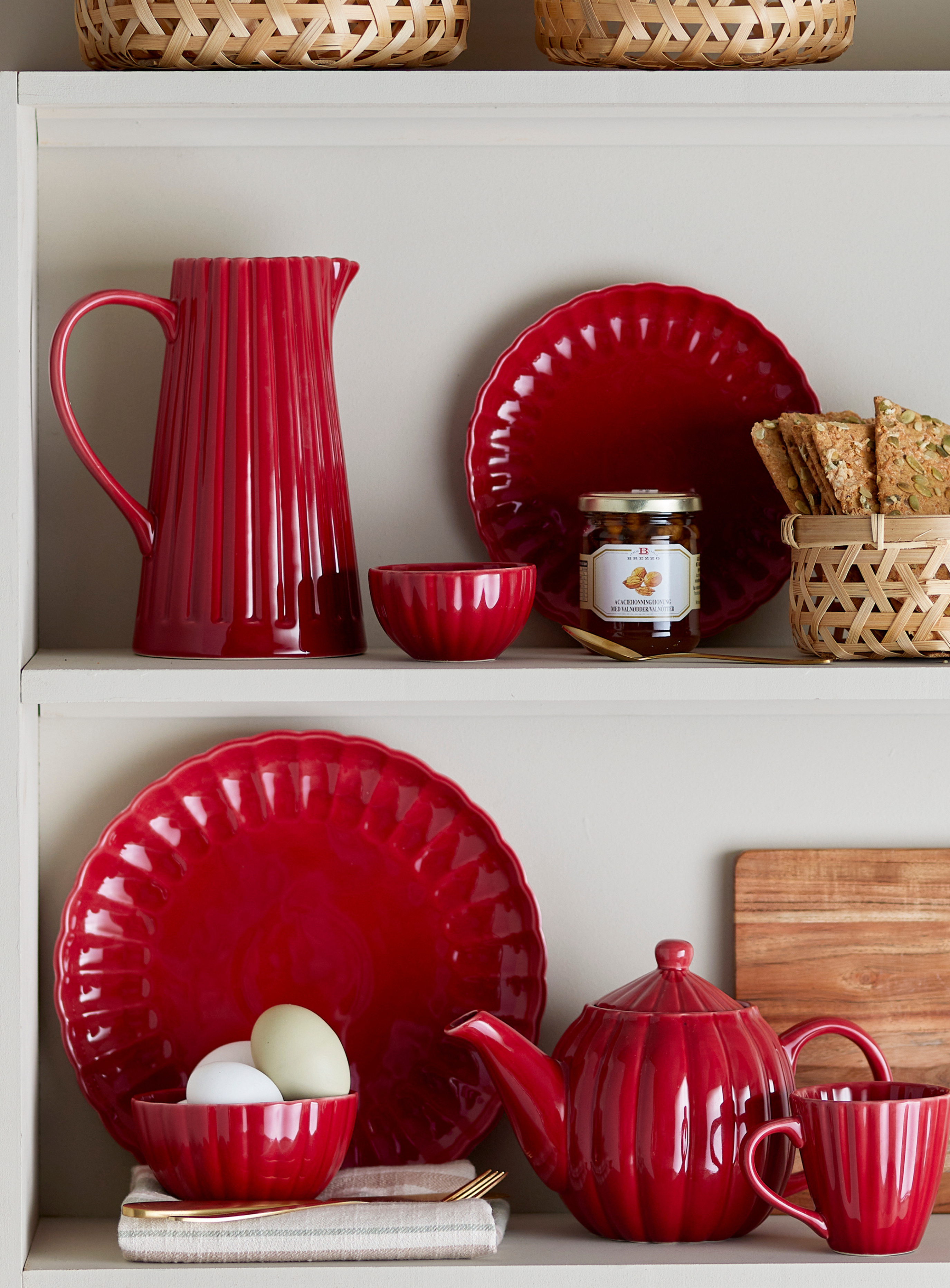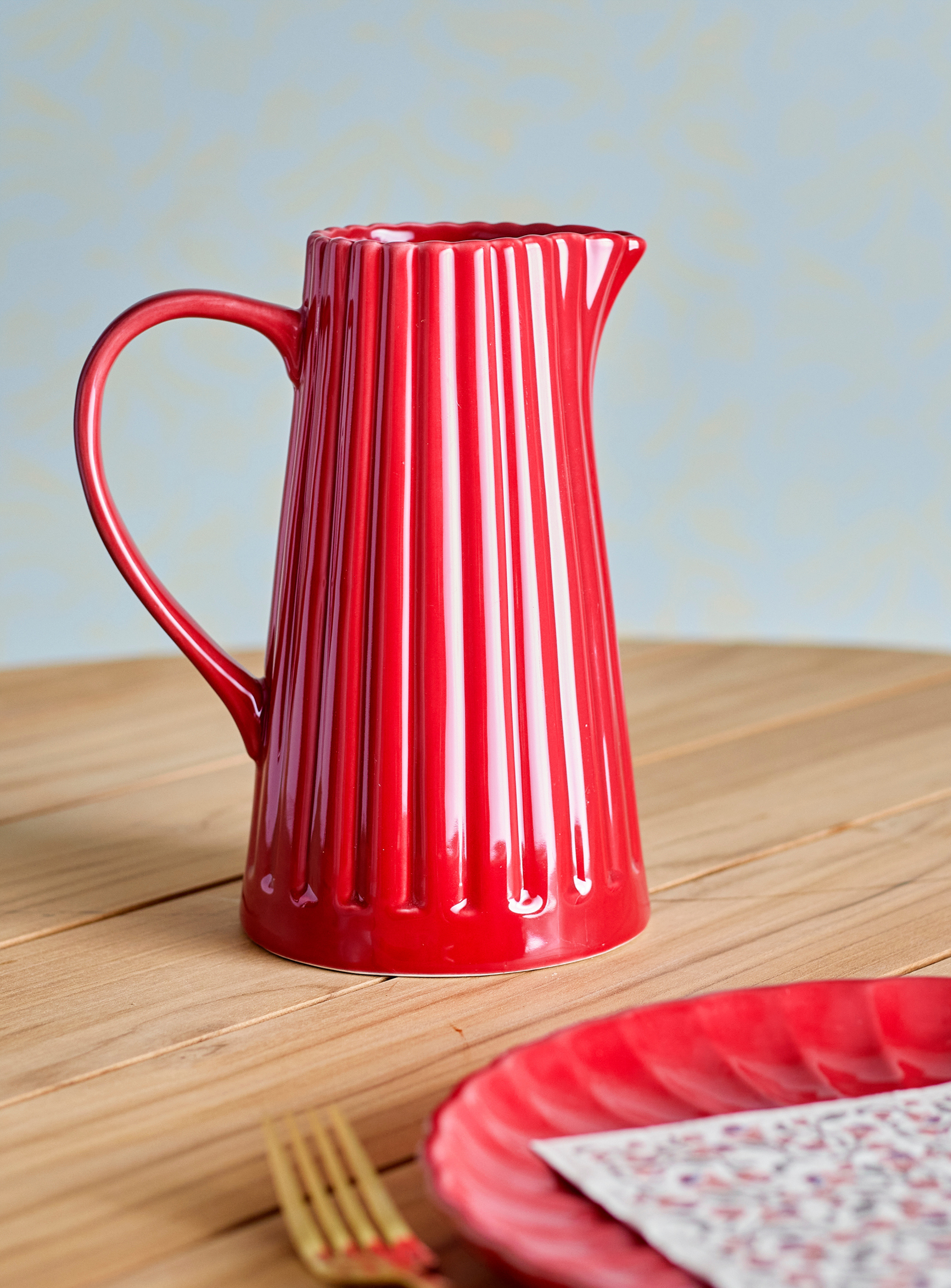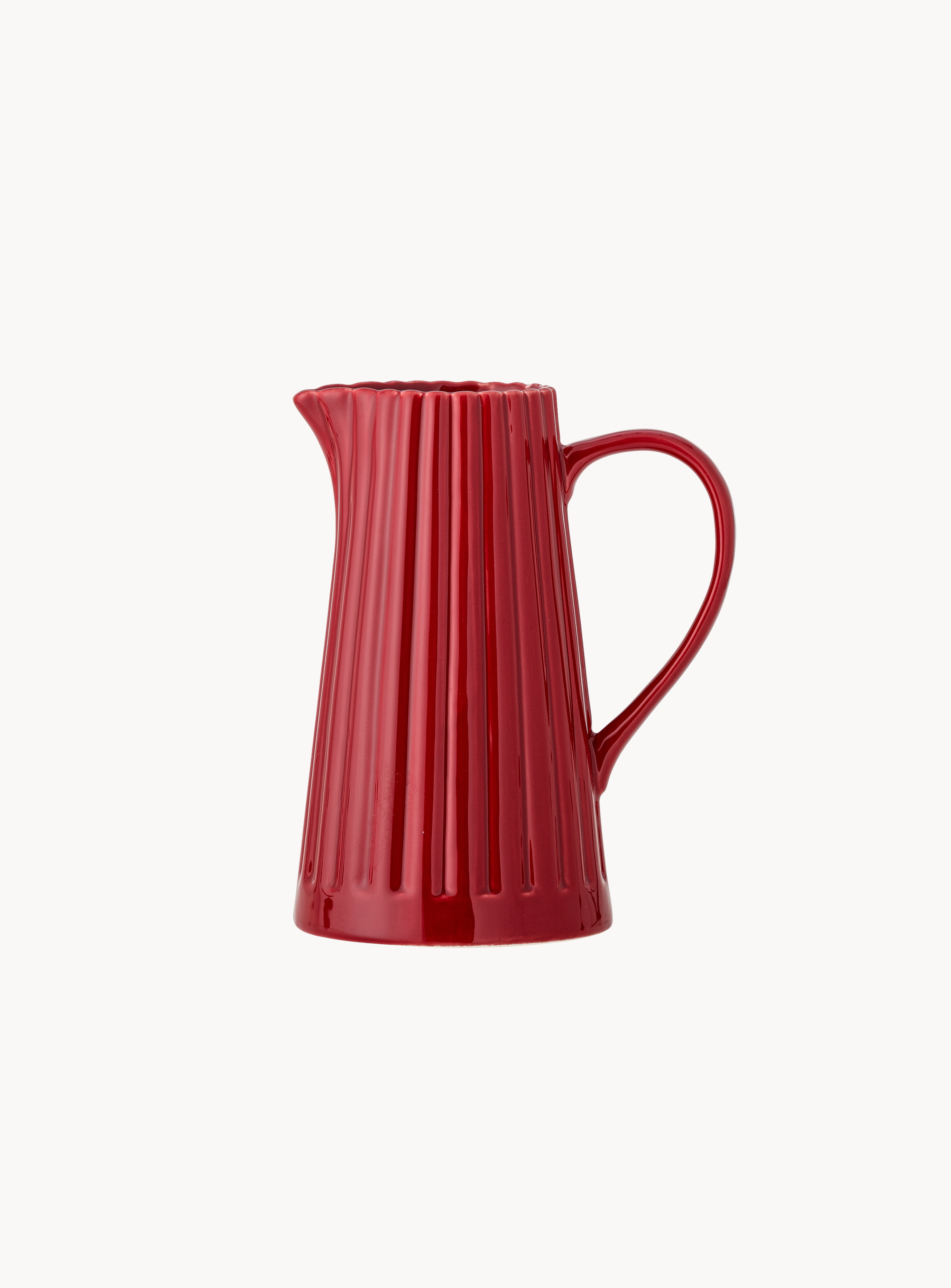 Der Latina Krug ist aus Steingut gefertigt und mit einer tiefroten Glasur veredelt, die dem Krug einen warmen, ausdrucksstarken Look verleiht. Die schlanke Form und die feinen vertikalen Linien sorgen für ein elegantes Design, das durch den abgerundeten Griff harmonisch ergänzt wird. Jede Kanne ist ein Unikat, da die Glasur in Farbnuancen variieren kann. Mit einem Fassungsvermögen von 1200 ml eignet sich der Krug perfekt zum Servieren von Wasser, Saft oder selbstgemachten Getränken – im Alltag wie zu besonderen Anlässen.