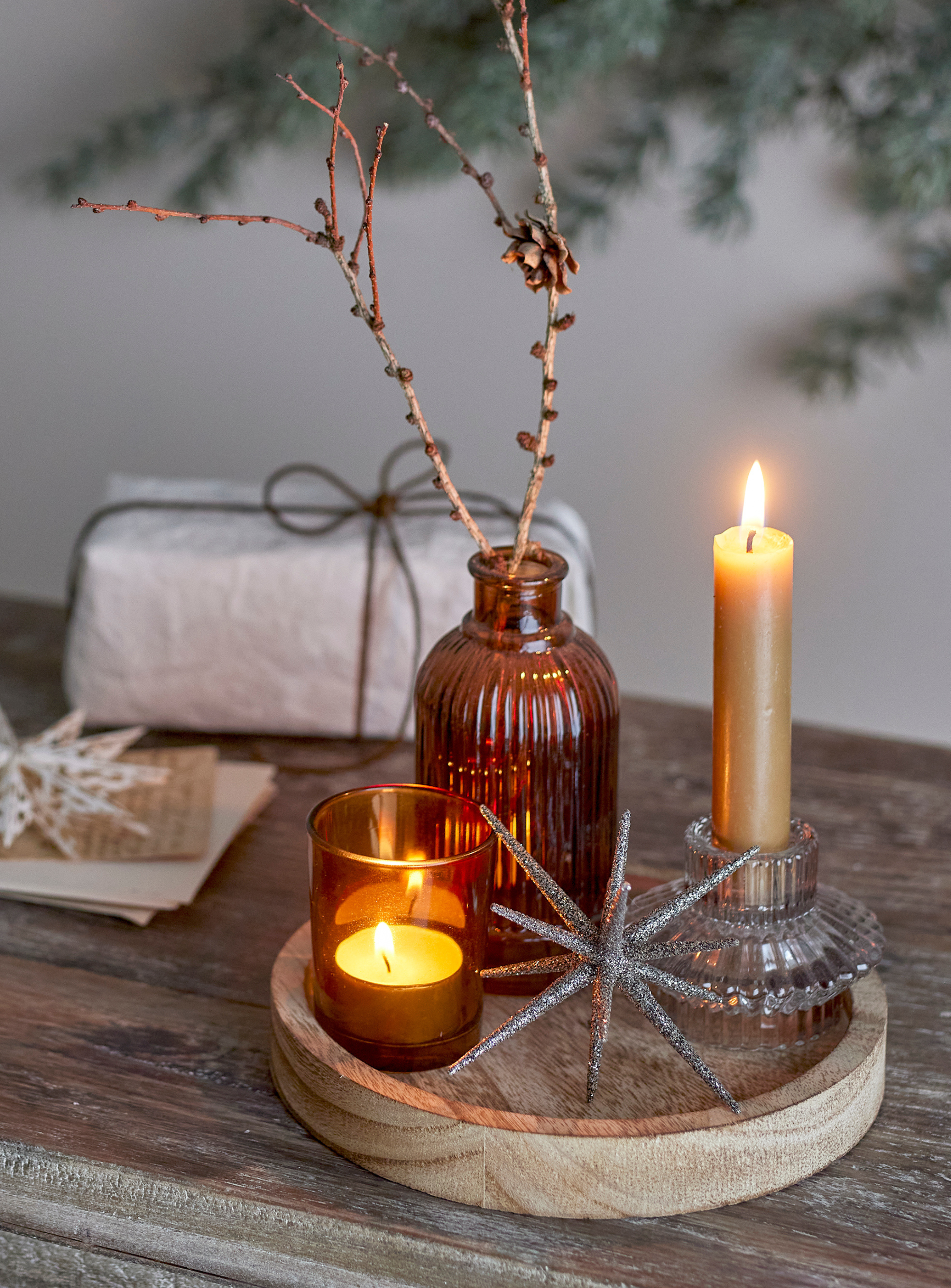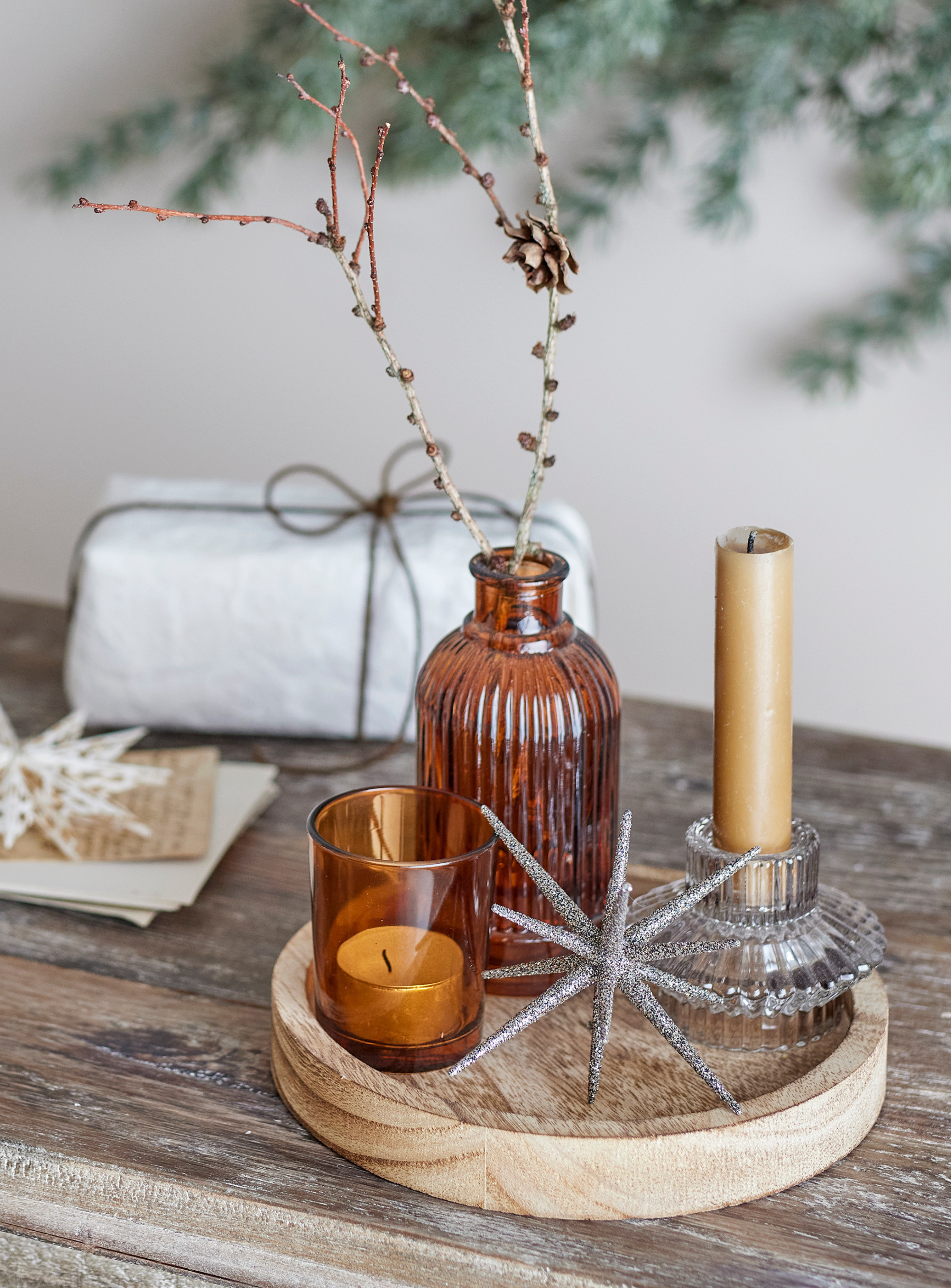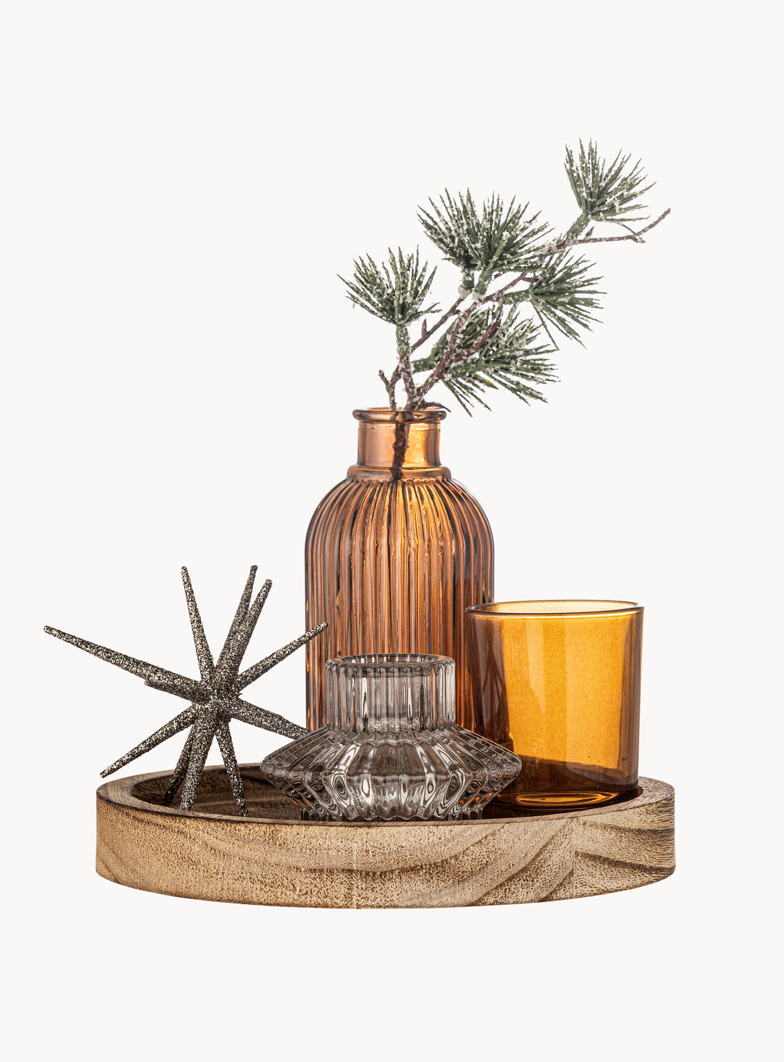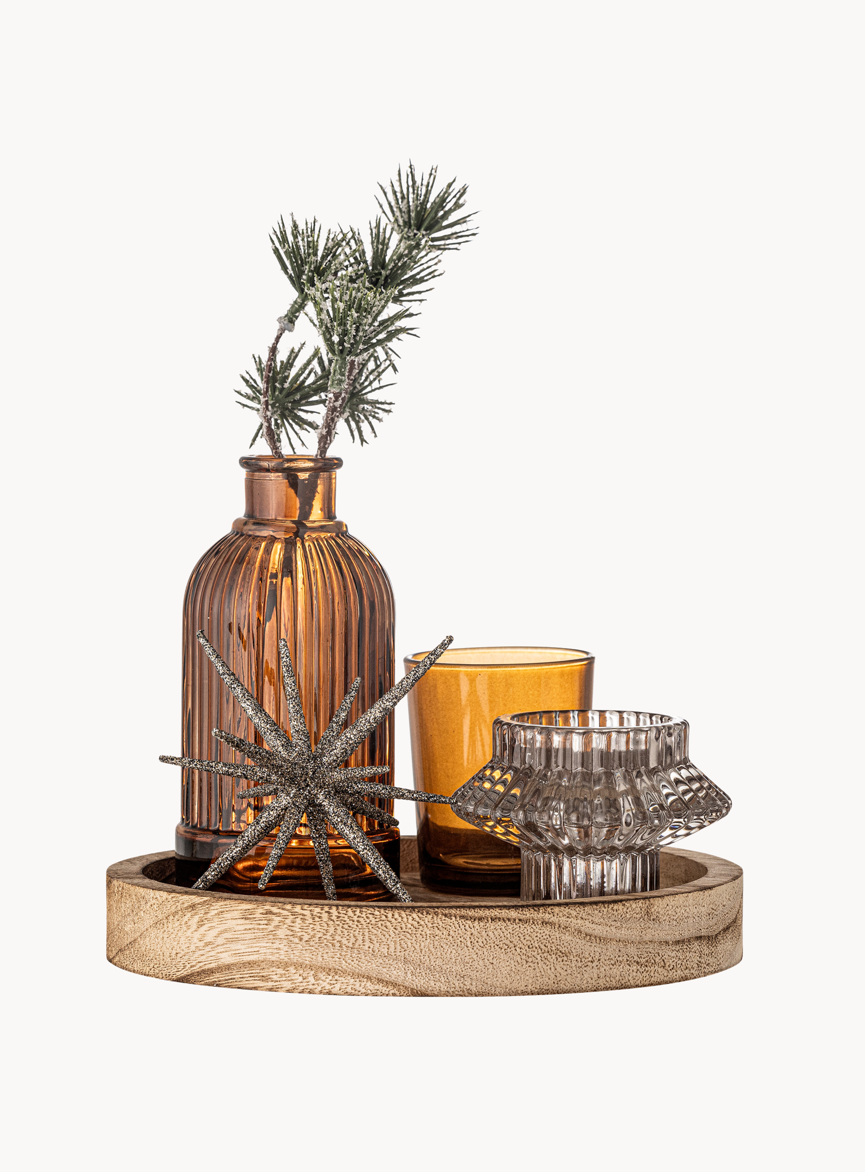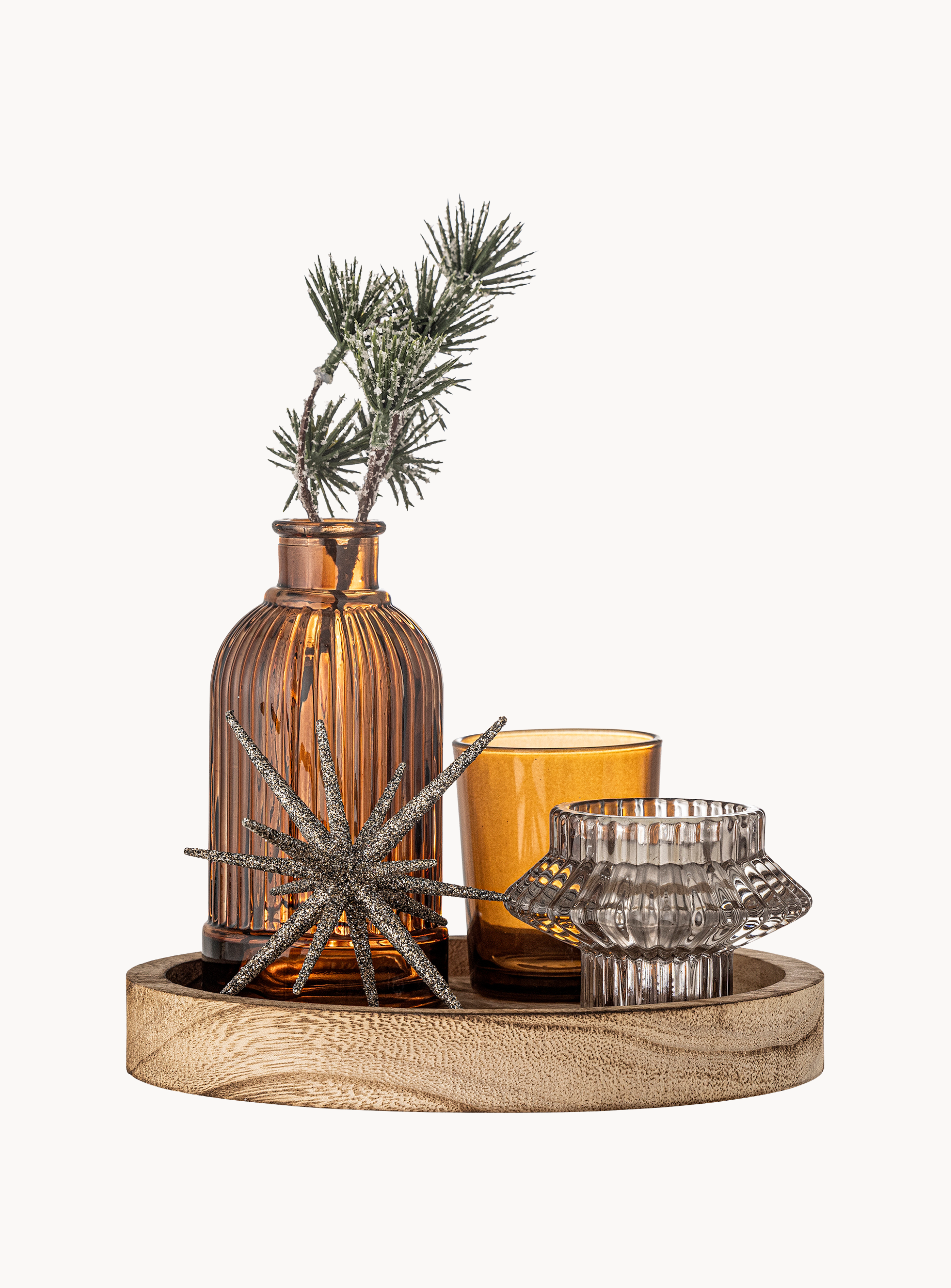 Das Sanga Tablett mit Teelichthaltern von Bloomingville ist eine stilvolle und vielseitige Ergänzung für deine Weihnachtsdekoration. Das runde Tablett aus Holz ist liebevoll arrangiert mit dekorativen Glas-Teelichthaltern, einem glitzernden Stern und einer Vase mit einem künstlichen Tannenzweig. Besonders praktisch: Einer der Teelichthalter kann umgedreht und als klassischer Kerzenhalter genutzt werden. Mit seinem harmonischen Mix aus Glas, Holz und natürlichen Akzenten sorgt dieses Set für festliche Gemütlichkeit – perfekt als Tischdekoration oder als geschmackvolles Geschenk.