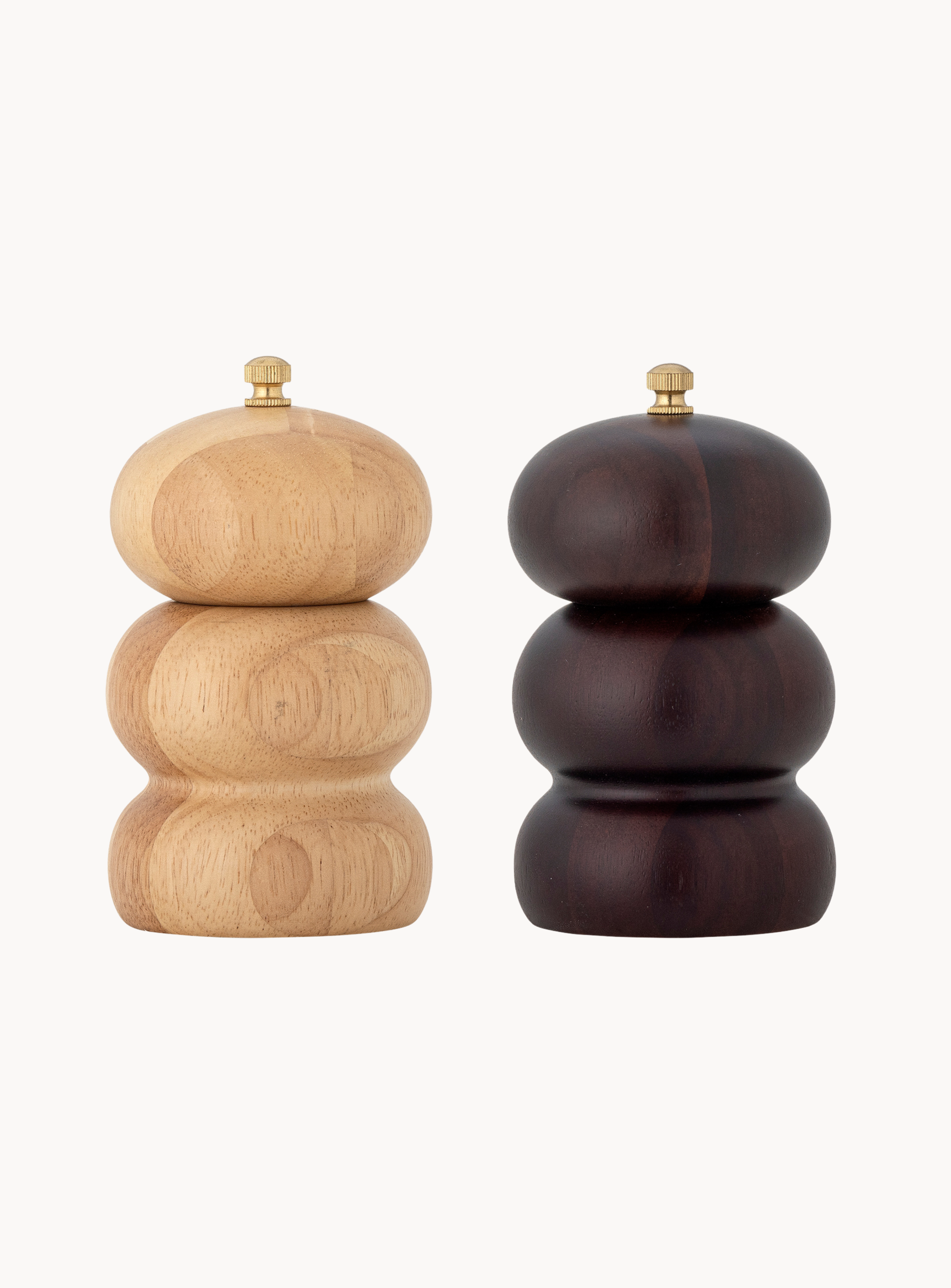 Die Marge Salz- und Pfeffermühlen kommen als harmonisches Duo aus hellem und dunklem Gummibaumholz. Die weichen, geschwungenen Formen und die transparente Lackierung verleihen dem Set einen natürlichen, modernen Look, der sich perfekt in eine nordische Tischdekoration einfügt. Jede Mühle hat ein Fassungsvermögen von 55 ml und eignet sich ideal für den täglichen Gebrauch – stilvoll, griffig und langlebig.