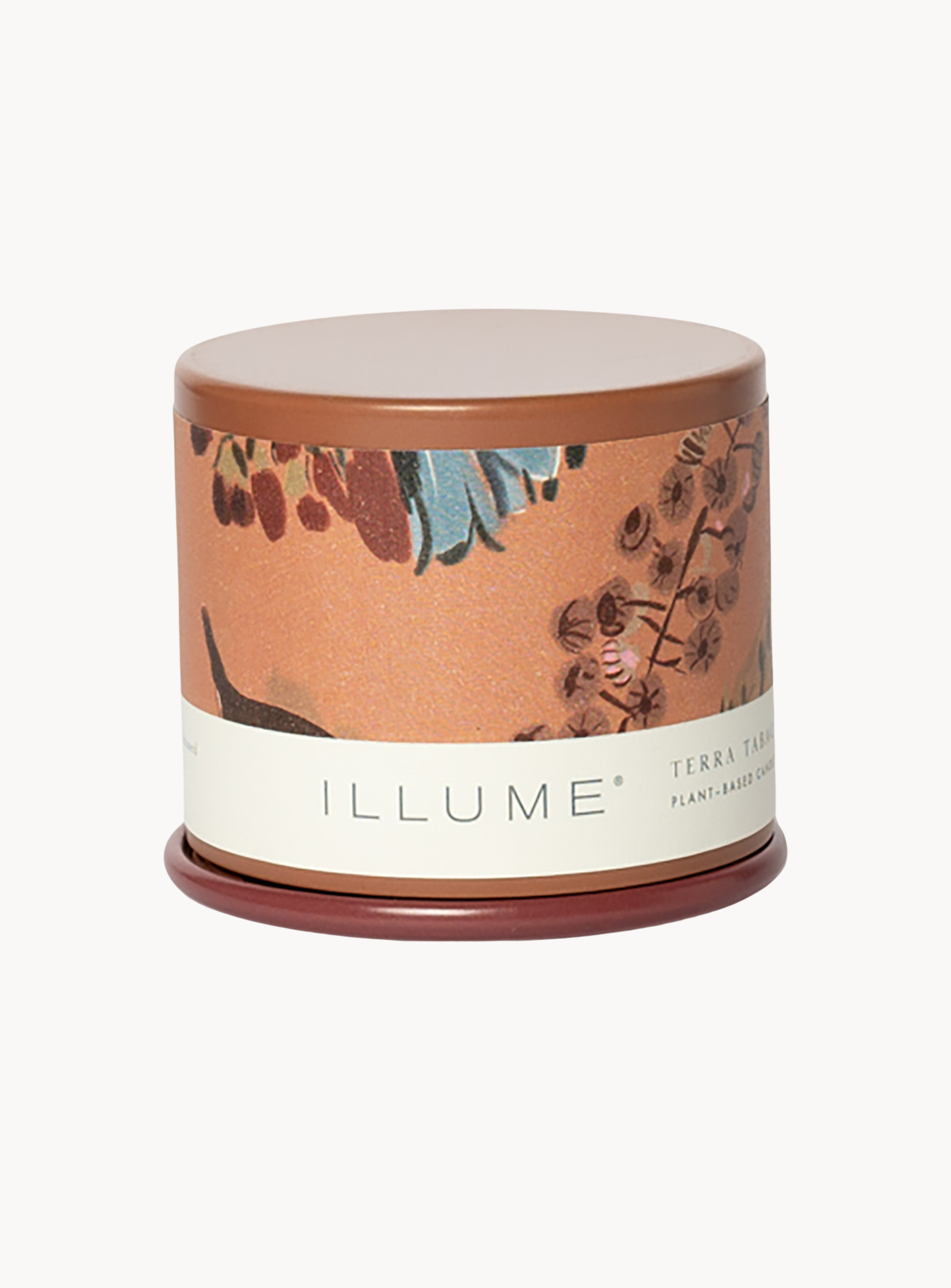 Die Terra Tabac Demi Vanity Tin Kerze von ILLUME verströmt einen warmen, sinnlichen Duft mit Noten von Kaschmirmoschus, hellen Tabakblättern und sonnengereiften Orangen. Diese harmonische Komposition schafft eine elegante, beruhigende Atmosphäre – ideal für entspannte Stunden zu Hause oder im Büro.