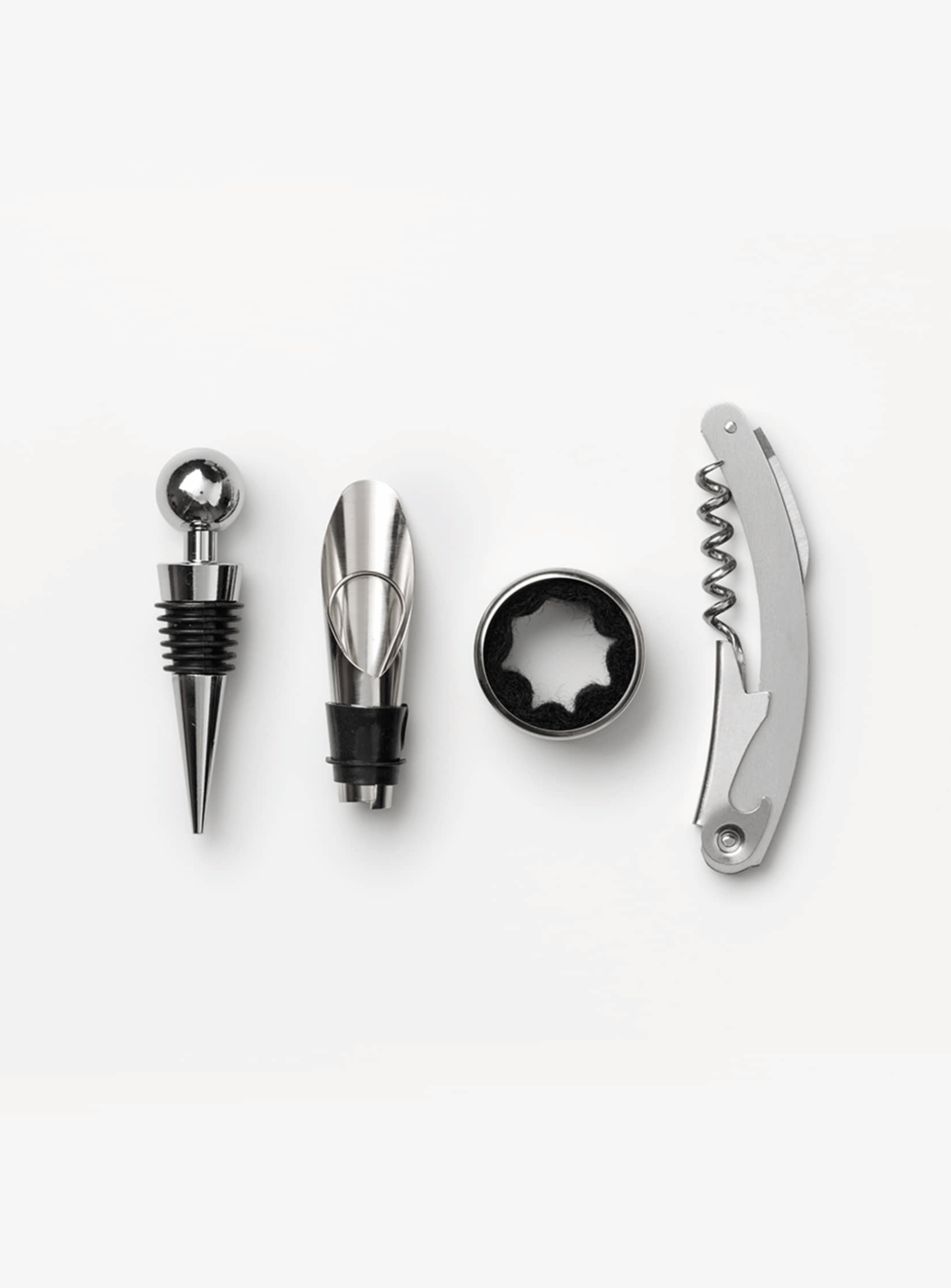 The Essentials ist ein stilvolles Weinset, das alle wichtigen Werkzeuge für ein gelungenes Weinerlebnis vereint. Verpackt in einer eleganten Box im Buchformat eignet es sich perfekt als Geschenk oder als geschmackvolle Ergänzung der eigenen Hausbar. Im Inneren befinden sich vier hochwertige Edelstahl Werkzeuge: ein Öffner, ein Stopper, ein Ausgießer und ein Tropfenfänger. Jedes Teil ist für eine einfache, angenehme Handhabung gestaltet und spülmaschinengeeignet.