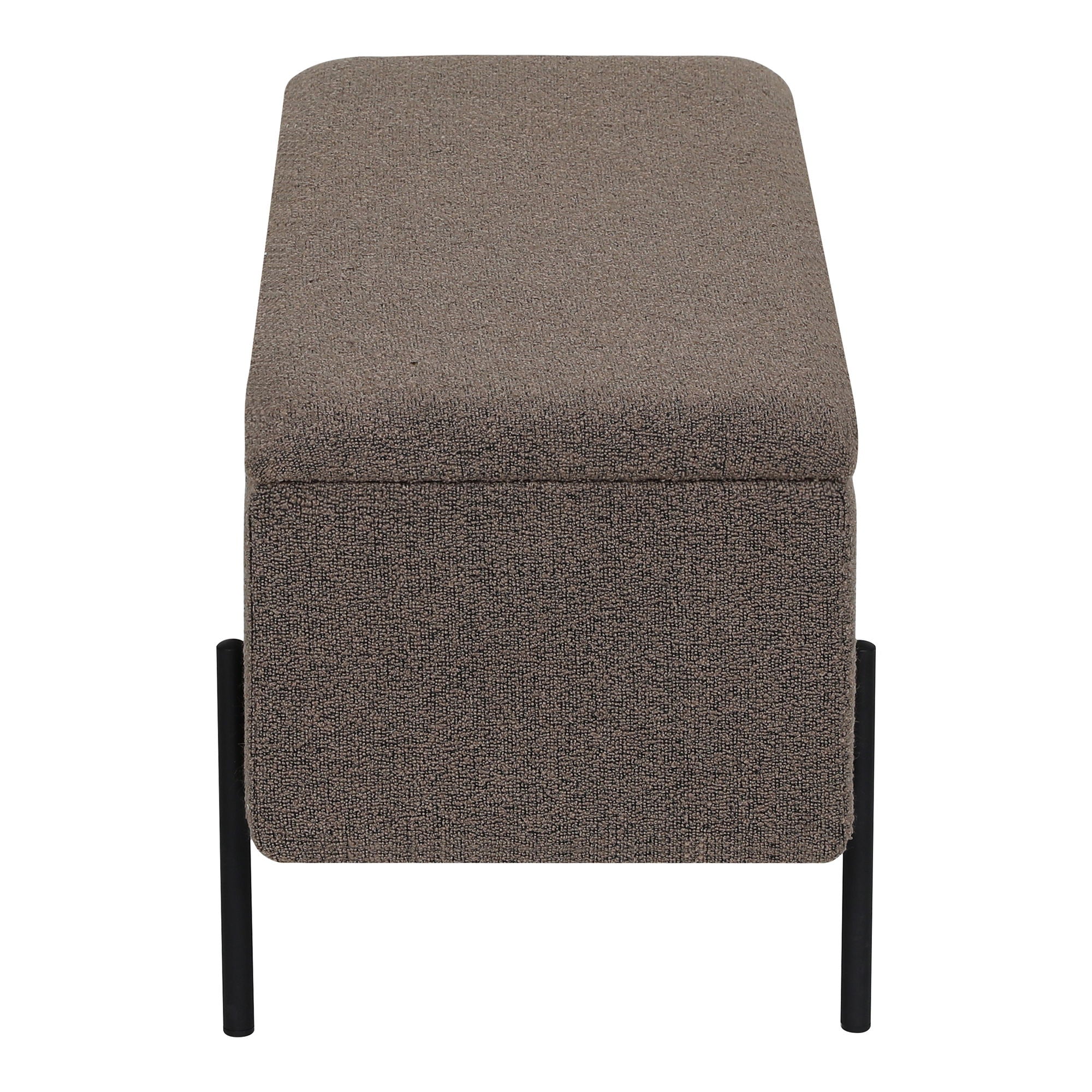 Die Watford Bank kombiniert modernes Design mit praktischer Funktionalität. Der Bezug aus weichem Bouclé-Stoff in warmem Braun verleiht ihr eine elegante, wohnliche Ausstrahlung. Unter der Sitzfläche befindet sich ein großzügiger Stauraum – ideal für Decken, Kissen oder andere Alltagsgegenstände.