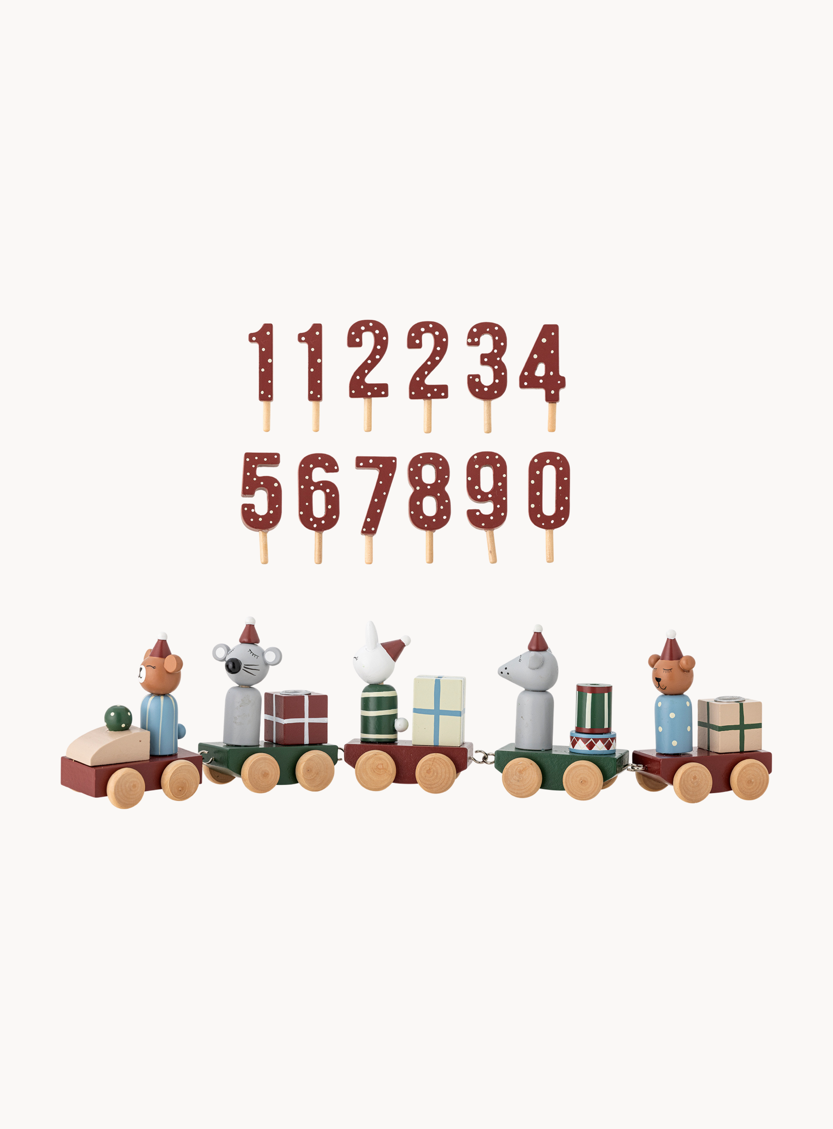 Die Junaid Deko von Bloomingville ist ein festlicher Zug aus FSC®-zertifiziertem Holz, der die Tage bis Weihnachten stilvoll zählen lässt. Mit fünf liebevoll gestalteten Waggons und kleinen Figuren bringt er weihnachtliche Stimmung in jedes Zuhause. Der Zug enthält austauschbare Zahlen von 0 bis 9 (plus eine zusätzliche 1 und 2) für den Countdown bis Heiligabend und bietet zudem Platz für zwei Kerzen. In einer schönen Geschenkbox verpackt, ist er das perfekte Präsent für die Adventszeit.