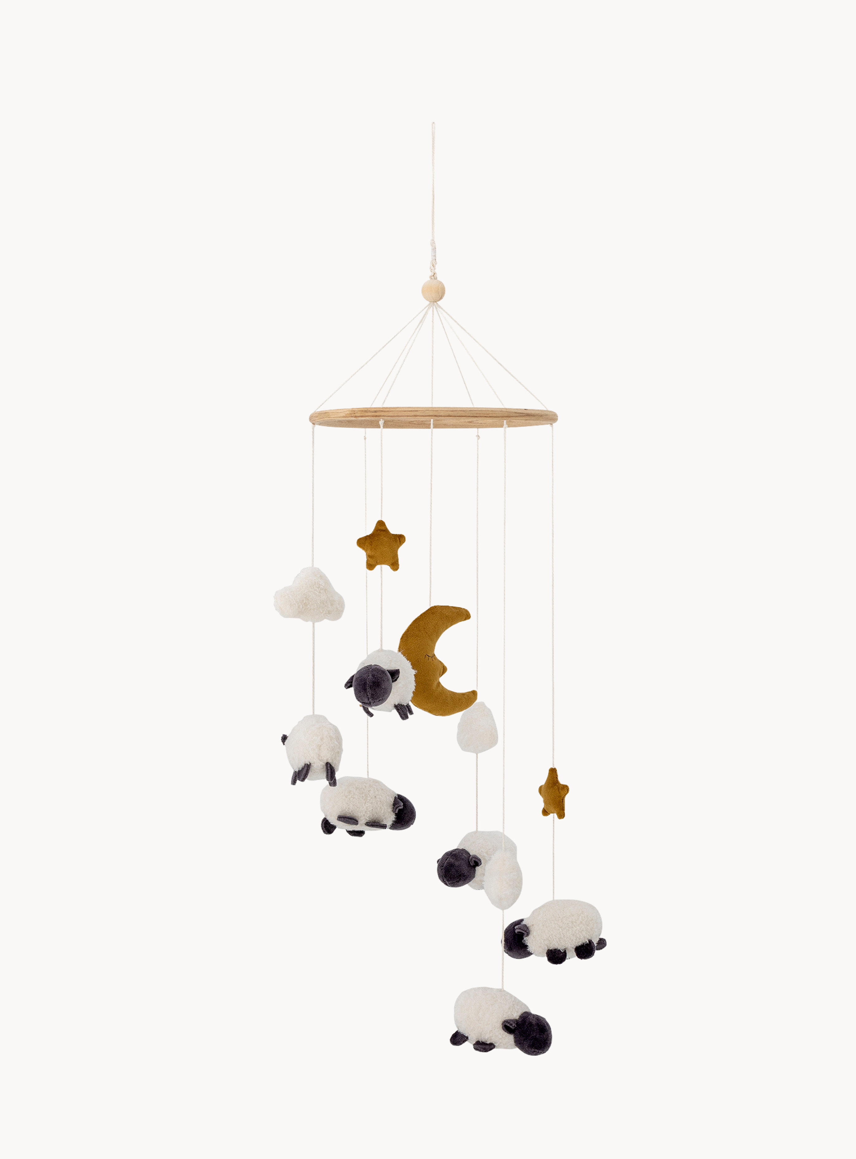 Das liebevoll gestaltete Mobile zeigt kleine, weiche Schafe aus Polyester und bringt eine ruhige, verspielte Stimmung ins Kinderzimmer. Über dem Wickeltisch oder Babybett aufgehängt, wirkt es beruhigend und dekorativ zugleich. Durch sein leichtes Design bewegt es sich sanft im Luftzug und sorgt für einen schönen Blickfang im Babyzimmer.