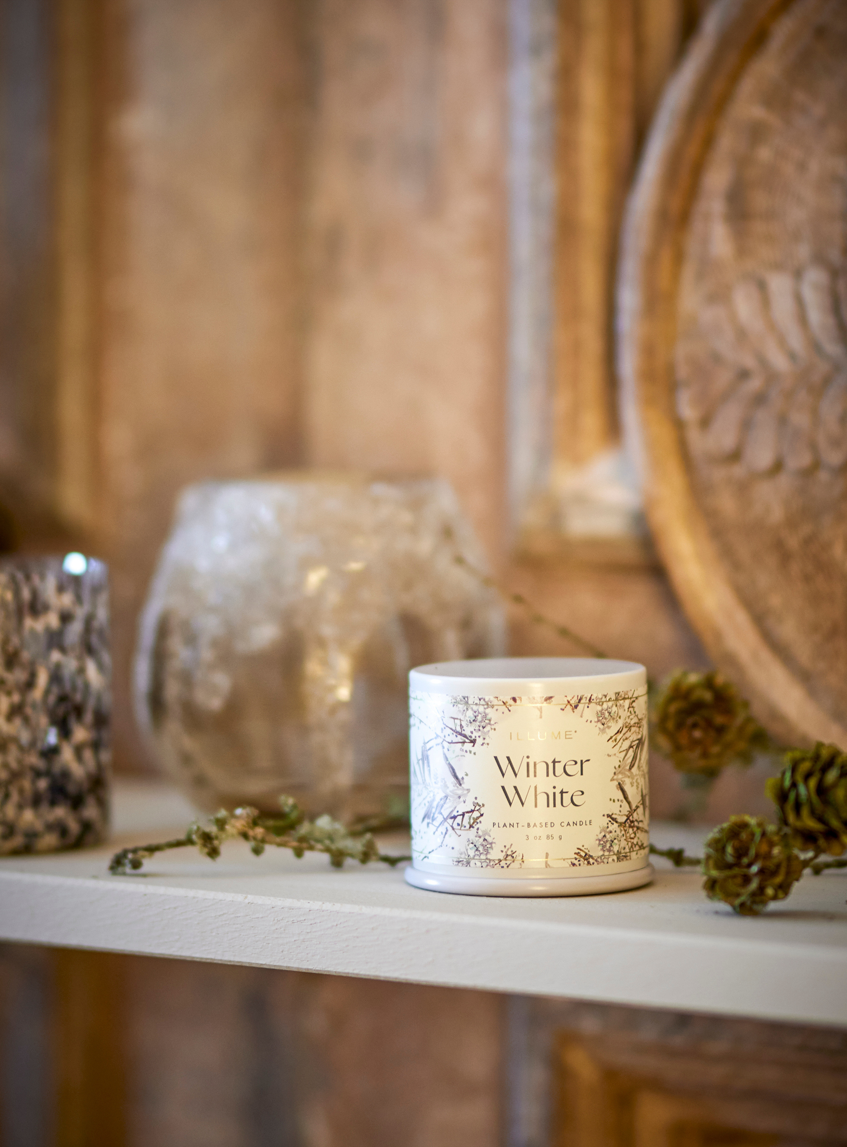 Die Winter White Demi Vanity Tin Kerze von ILLUME verleiht Ihrem Zuhause eine elegante und frische Atmosphäre. Mit Duftnoten von kühlem Kardamom, immergrünen Pflanzen und einem Hauch von spritzigem Zitrus verbreitet sie winterliche Leichtigkeit und Ruhe. Das stilvolle Zinngefäß reflektiert das Kerzenlicht sanft und ist nach Gebrauch wiederverwendbar.