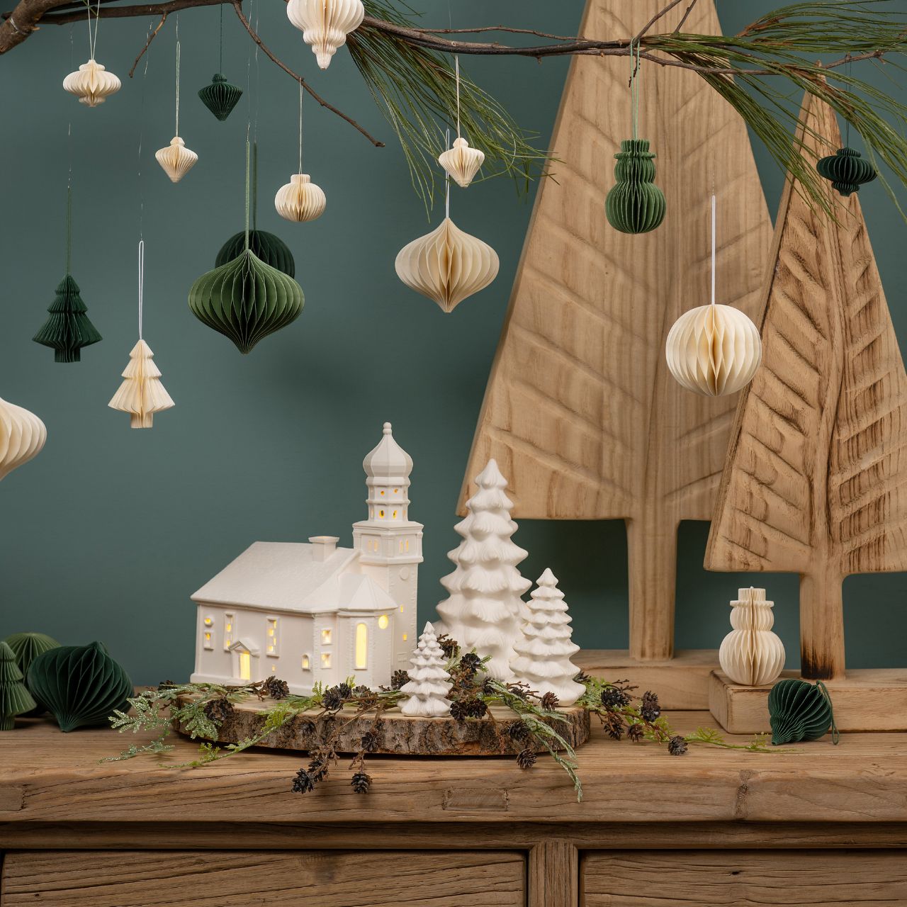 Ein Teelicht oder eine LED Kerze im Inneren sorgt für ein sanftes Leuchten, das durch die filigranen Fenster nach außen strahlt. Das Lichthaus eignet sich ideal für Sideboards, Fensterbänke oder festlich gedeckte Tische und kann einzeln oder als Teil eines dekorativen Arrangements verwendet werden.